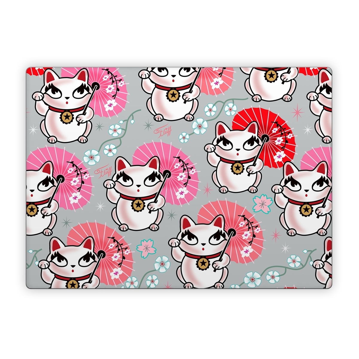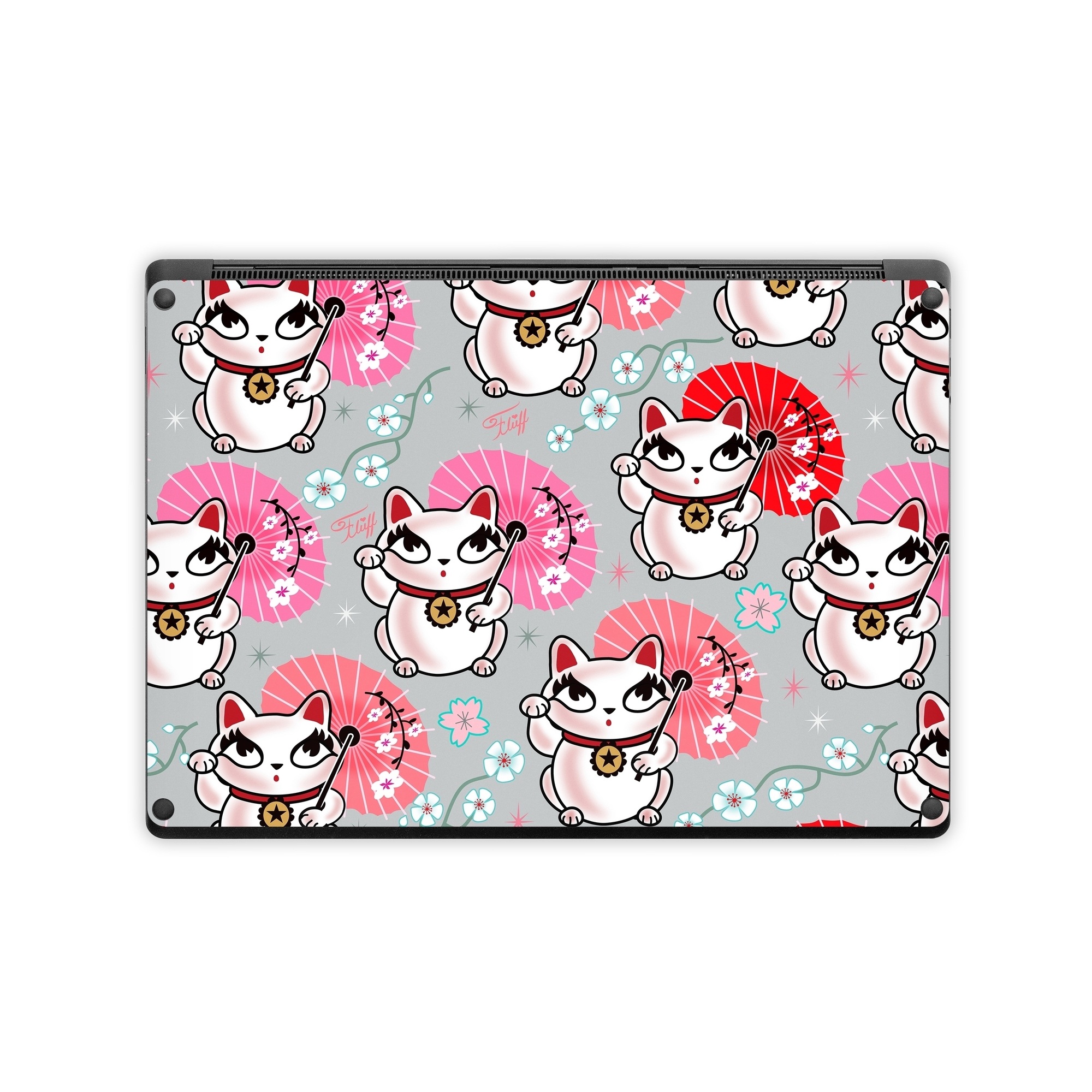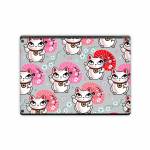 iStyles Microsoft Surface Laptop Series Skin design of Pink, Red, Cartoon, Design, Line, Textile, Pattern, Illustration, Smile, Fictional character, with white, red, pink, gray, blue, black colors, and tagged with patterns, animals, objects, cat, cats, fantasy, flower, flowers, grey, pink.