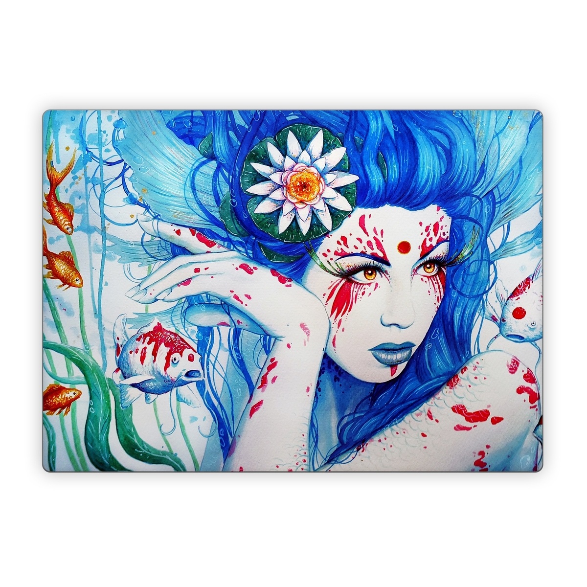 iStyles Microsoft Surface Laptop Series Skin design of Hairstyle, Paint, Art paint, Blue, Painting, Eyelash, Art, Artist, Electric blue, Illustration, with white, blue, red, yellow, green, orange colors, and tagged with animals, people, flowers, fantasy, blue, fish, goldfish, koi, lilypad, red, sea, woman.