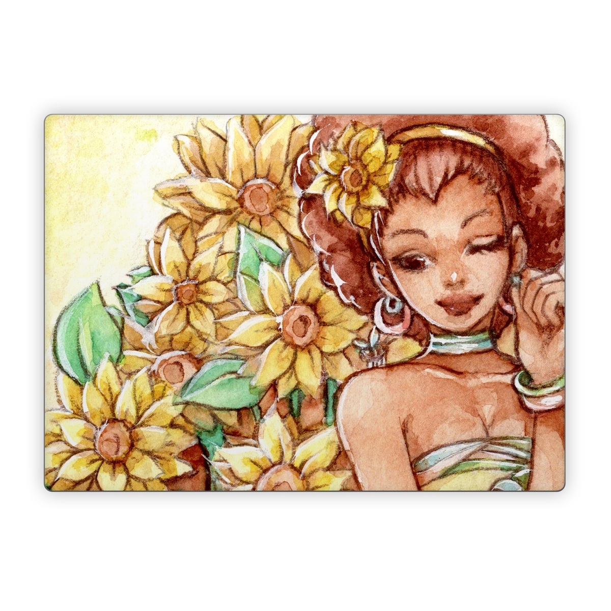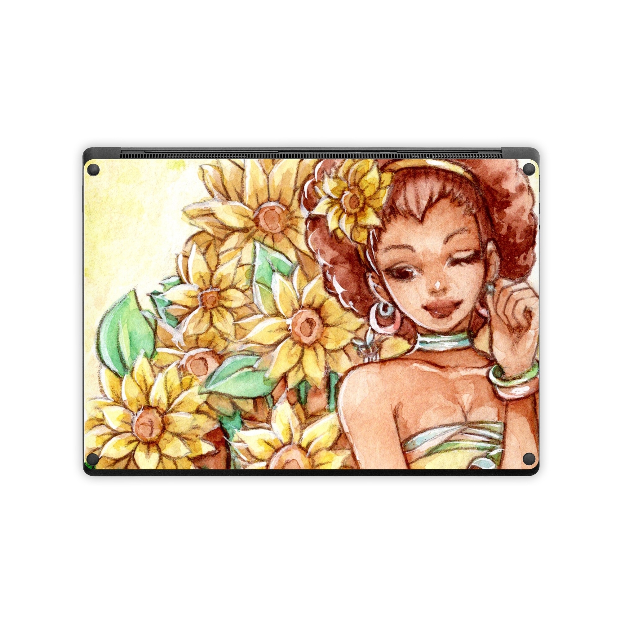 iStyles Microsoft Surface Laptop Series Skin design of Painting, Illustration, Art, Fictional character, Plant, Flower, Clip art, with yellow, orange, brown, green colors, and tagged with people, fineart, flowers, animals, brown, flower, flowers, girl, green, lady, paint, sketch, sunflower, sunflowers, watercolor, woman, yellow.