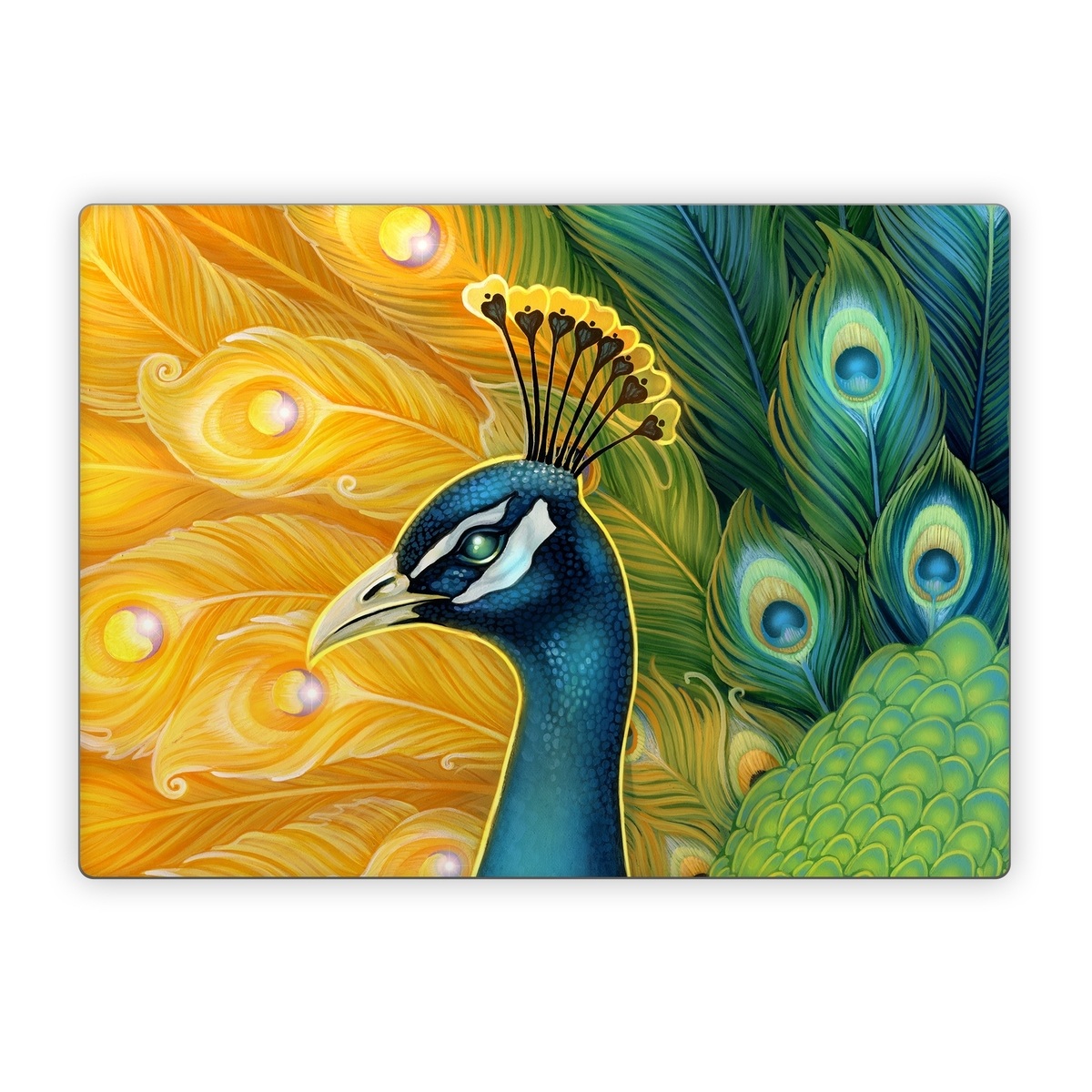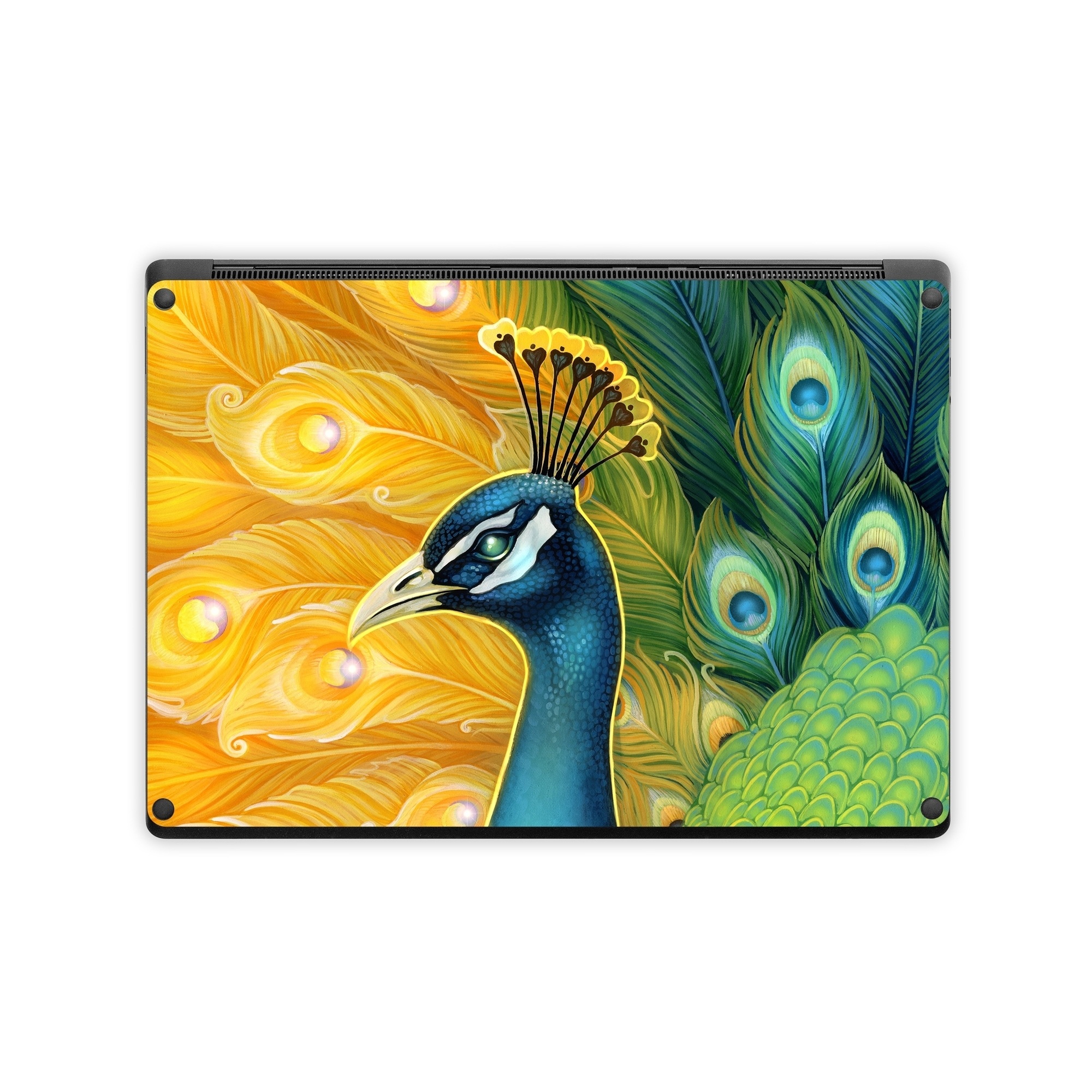 iStyles Microsoft Surface Laptop Series Skin design of Bird, Peafowl, Phasianidae, Beak, Organism, Art paint, Galliformes, Art, Feather, Painting, with yellow, orange, green, blue, white, black colors, and tagged with fantasy, animals, patterns, peacock, peahen, peafowl, feathers.