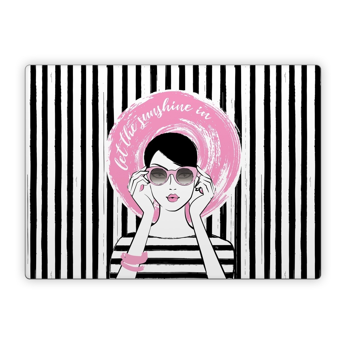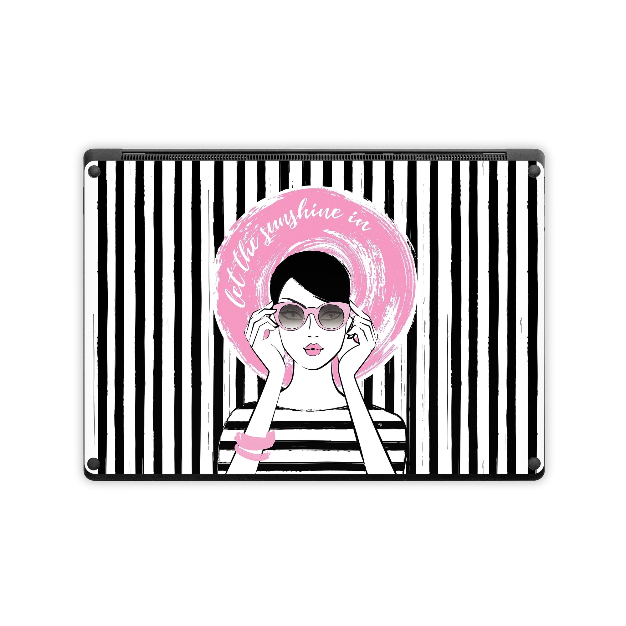 iStyles Microsoft Surface Laptop Series Skin design of Organ, Vision care, Purple, Pink, Violet, Font, Eyewear, Magenta, Line, Art, with black, white, pink, gray colors, and tagged with signs, objects, people, patterns, blackandwhite, girl, glasses, hat, pink, stripes.