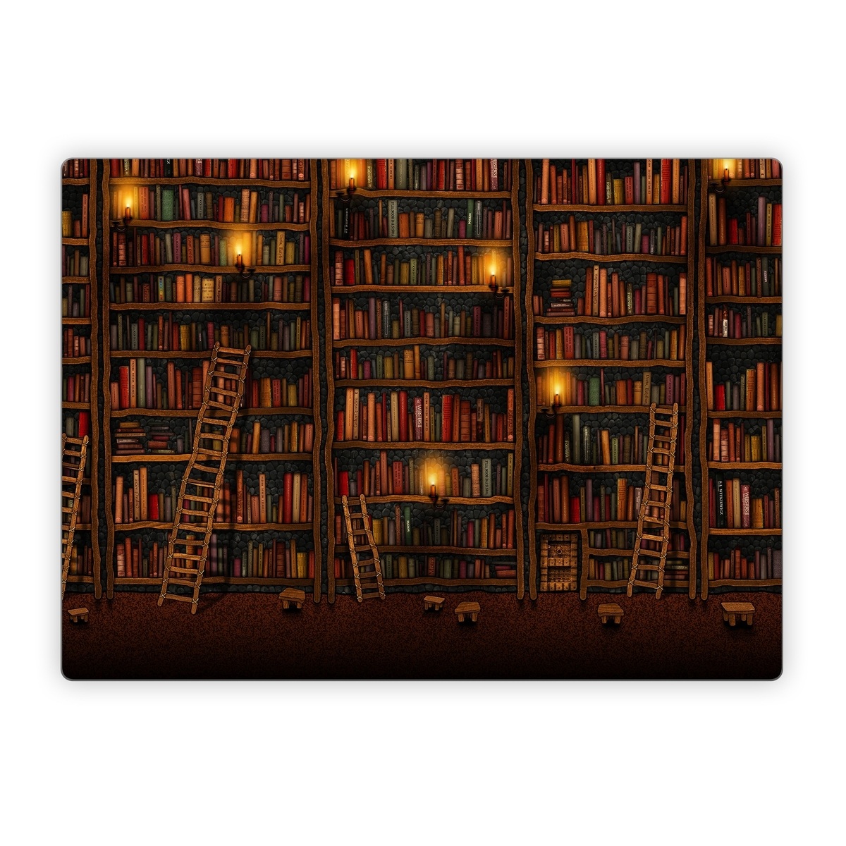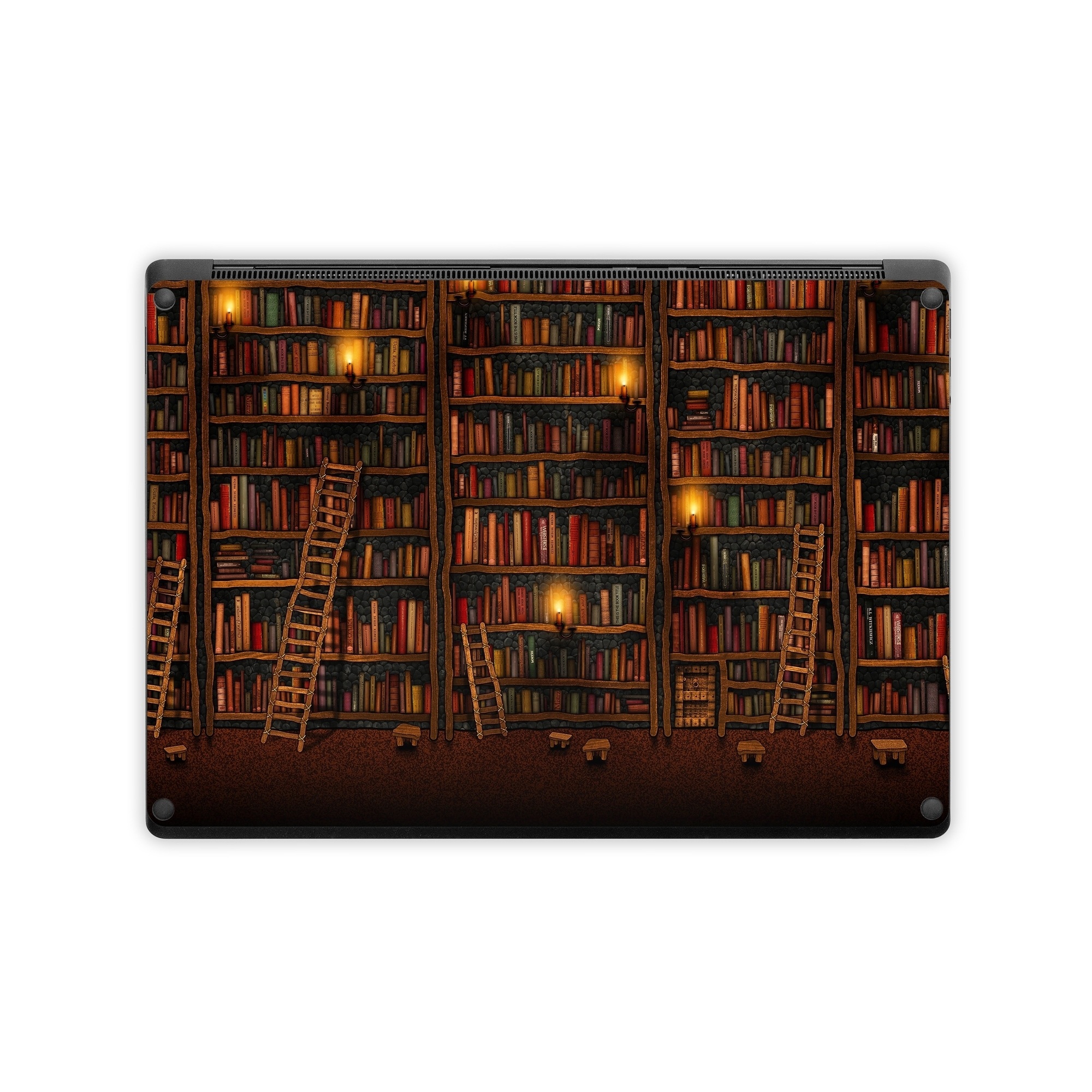 iStyles Microsoft Surface Laptop Series Skin design of Shelving, Library, Bookcase, Shelf, Furniture, Book, Building, Publication, Room, Darkness, with black, red colors, and tagged with fineart, objects.