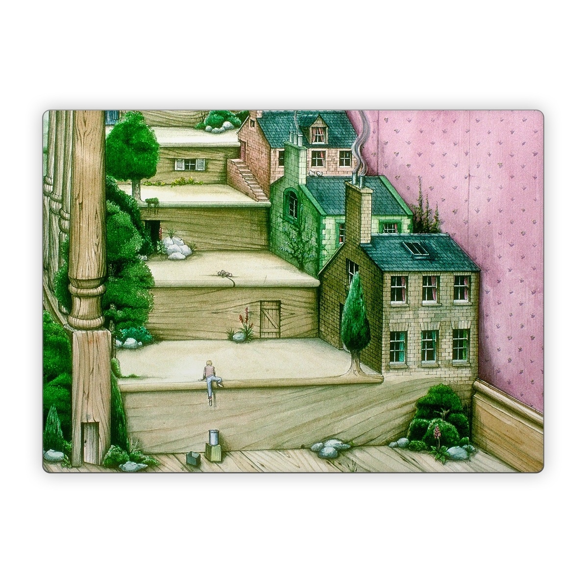 iStyles Microsoft Surface Laptop Series Skin design of Green, Stairs, House, Watercolor paint, Home, Illustration, Building, Wood, Plant, Sketch, with pink, green, brown colors, and tagged with objects, fineart, nature, urban, colinthompson, fineart, illustration, surreal.