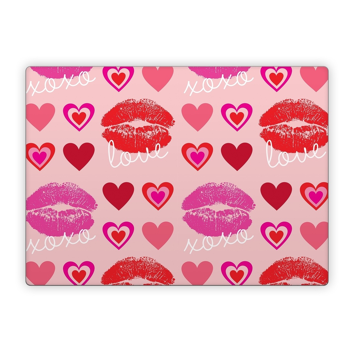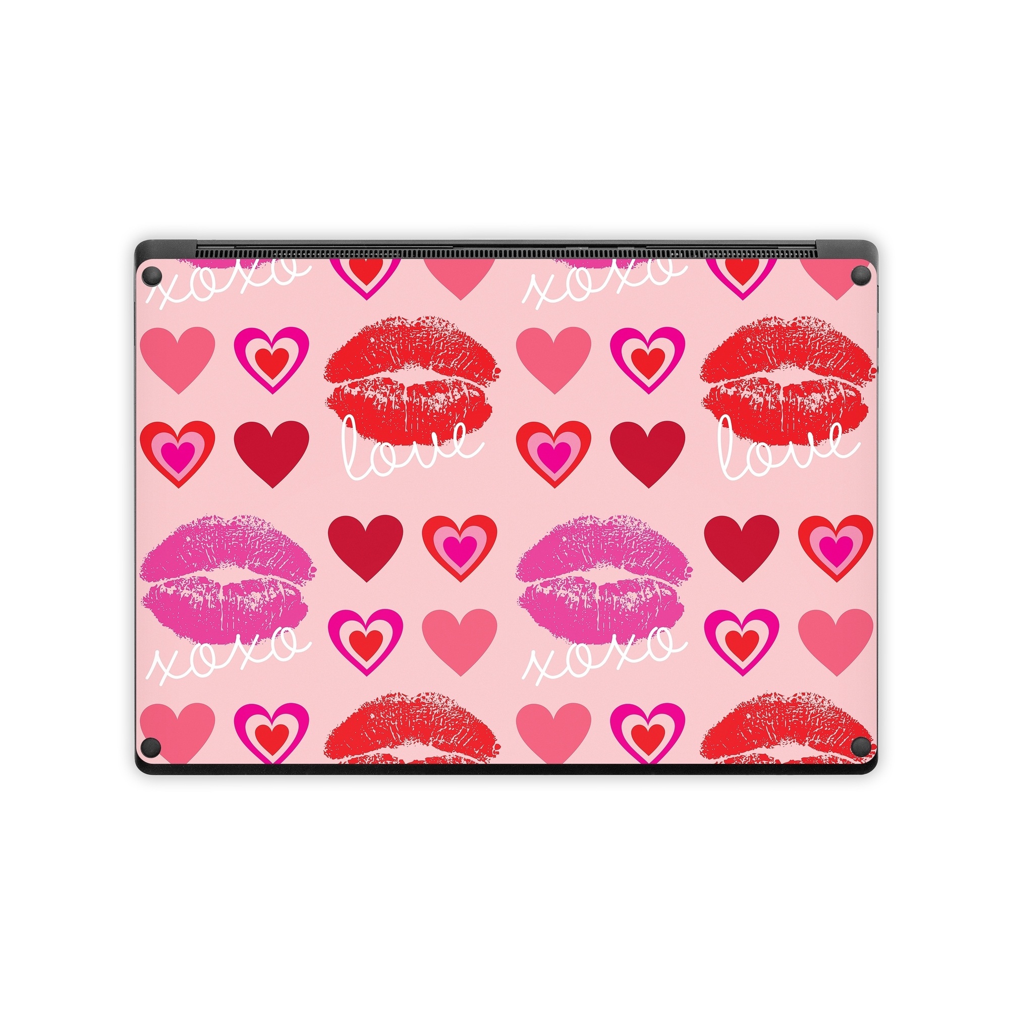 iStyles Microsoft Surface Laptop Series Skin design of Organ, Pink, Red, Font, Material property, Magenta, Heart, Pattern, Happy, Love, with pink, red, white colors, and tagged with patterns, hearts, signs, lips, lipstick, xoxo, love.