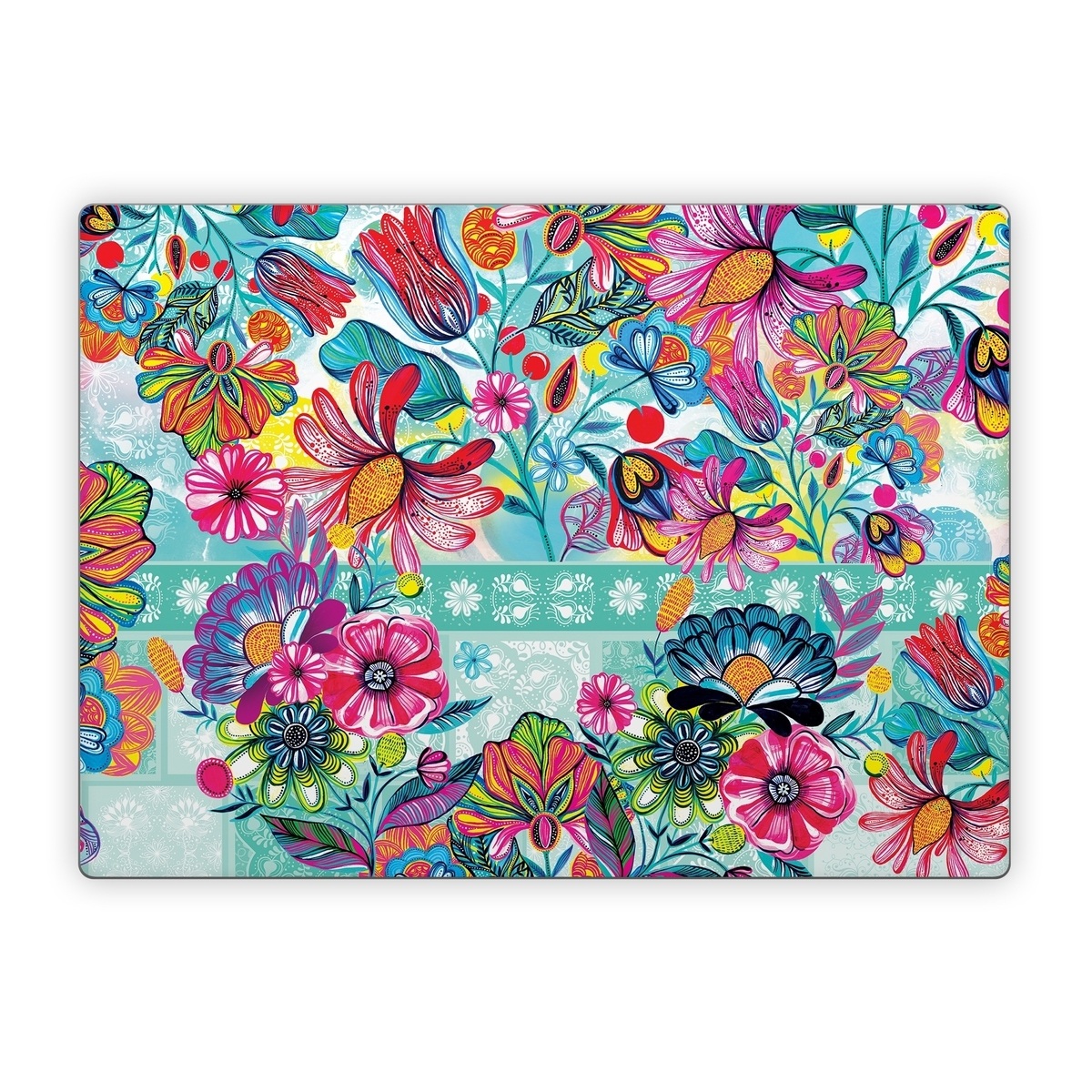 iStyles Microsoft Surface Laptop Series Skin design of Pattern, Floral design, Textile, Pink, Design, Flower, Visual arts, Wildflower, Plant, with blue, pink, purple, red, green, yellow, orange colors, and tagged with patterns, flowers, bright, carpintos, colorful, flowers, spring, summer, teal.