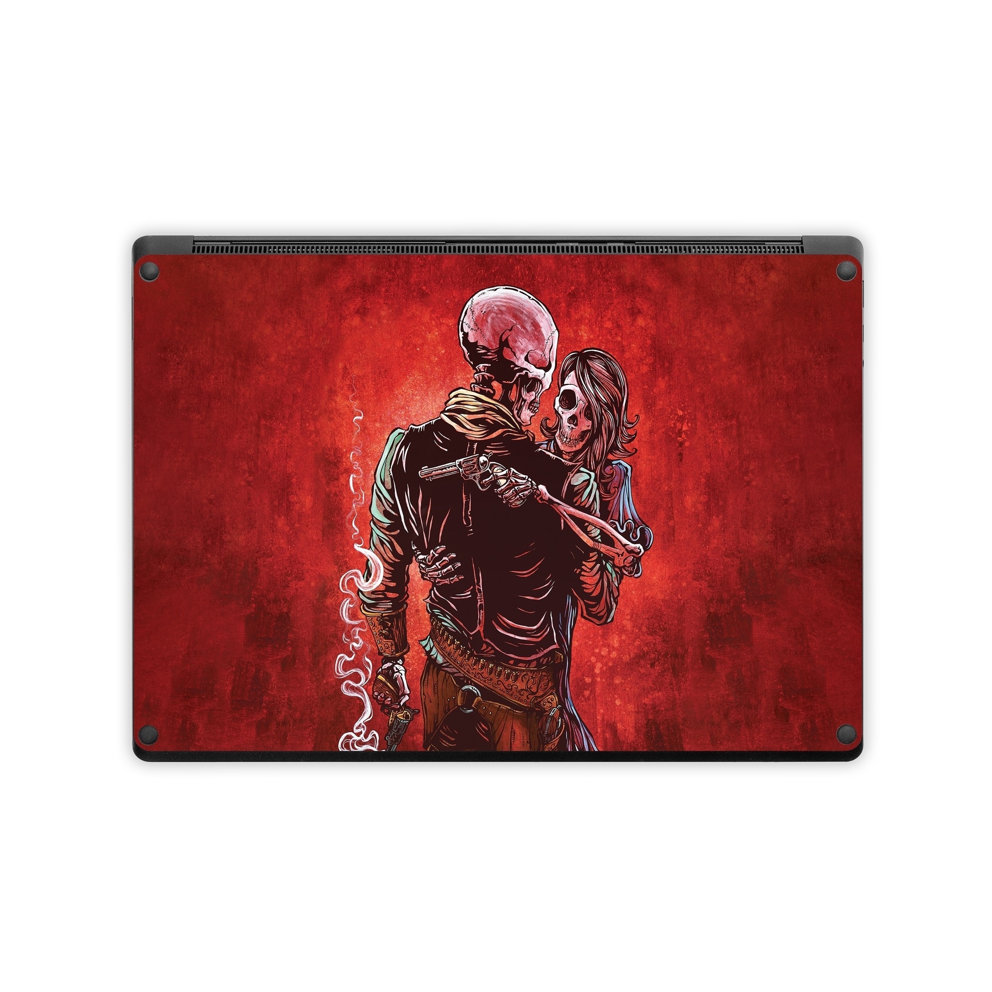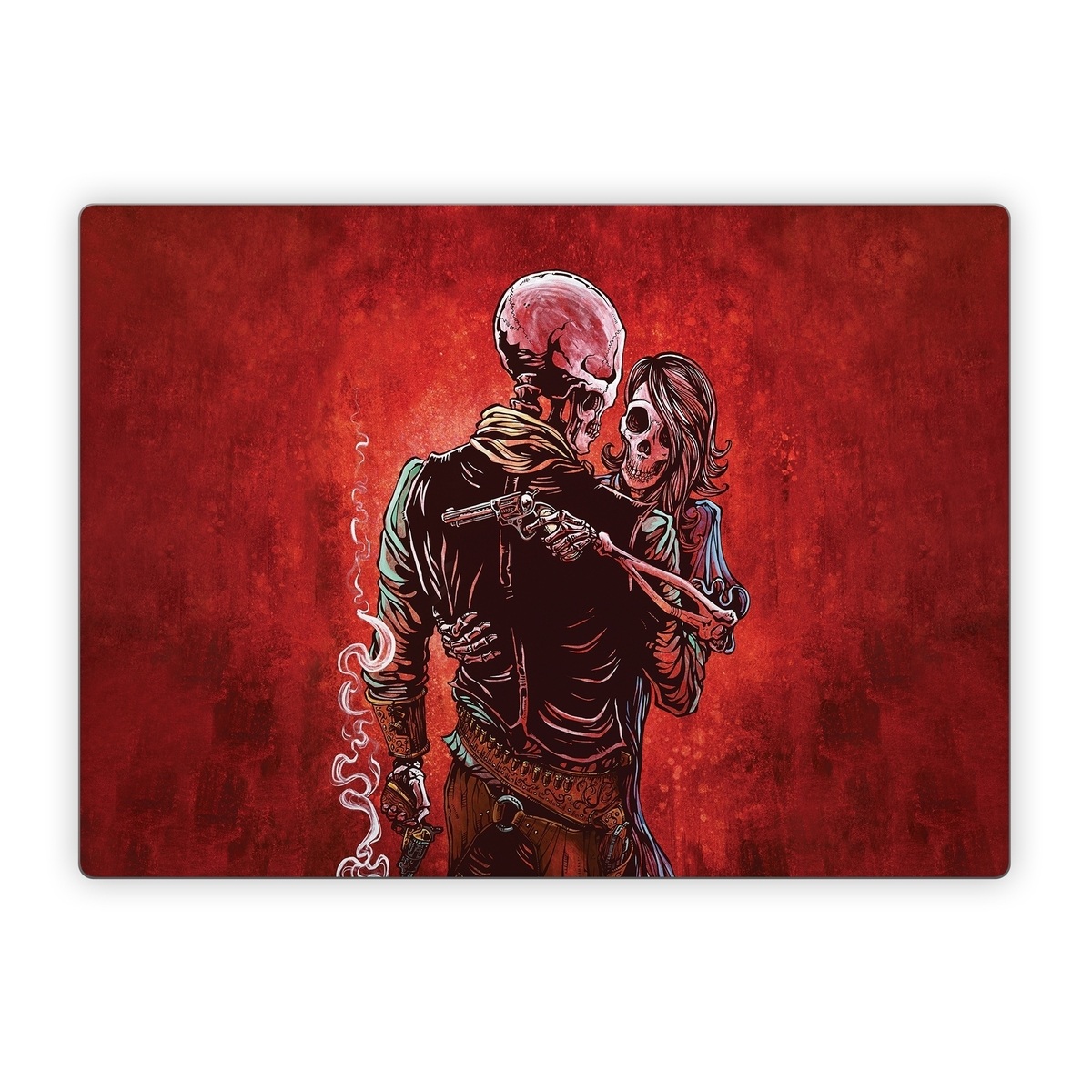 iStyles Microsoft Surface Laptop Series Skin design of Sleeve, Gesture, Painting, Art, Artist, Fictional character, Drawing, Paint, Illustration, Visual arts, with red, black, white, gray, brown colors, and tagged with skulls, objects, honesty, mistrust, faith, smoking, gun, couple.