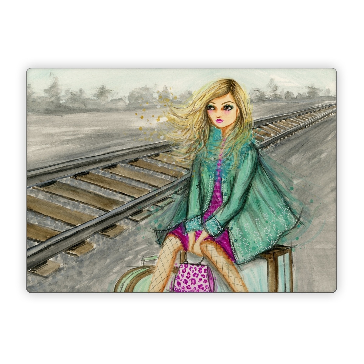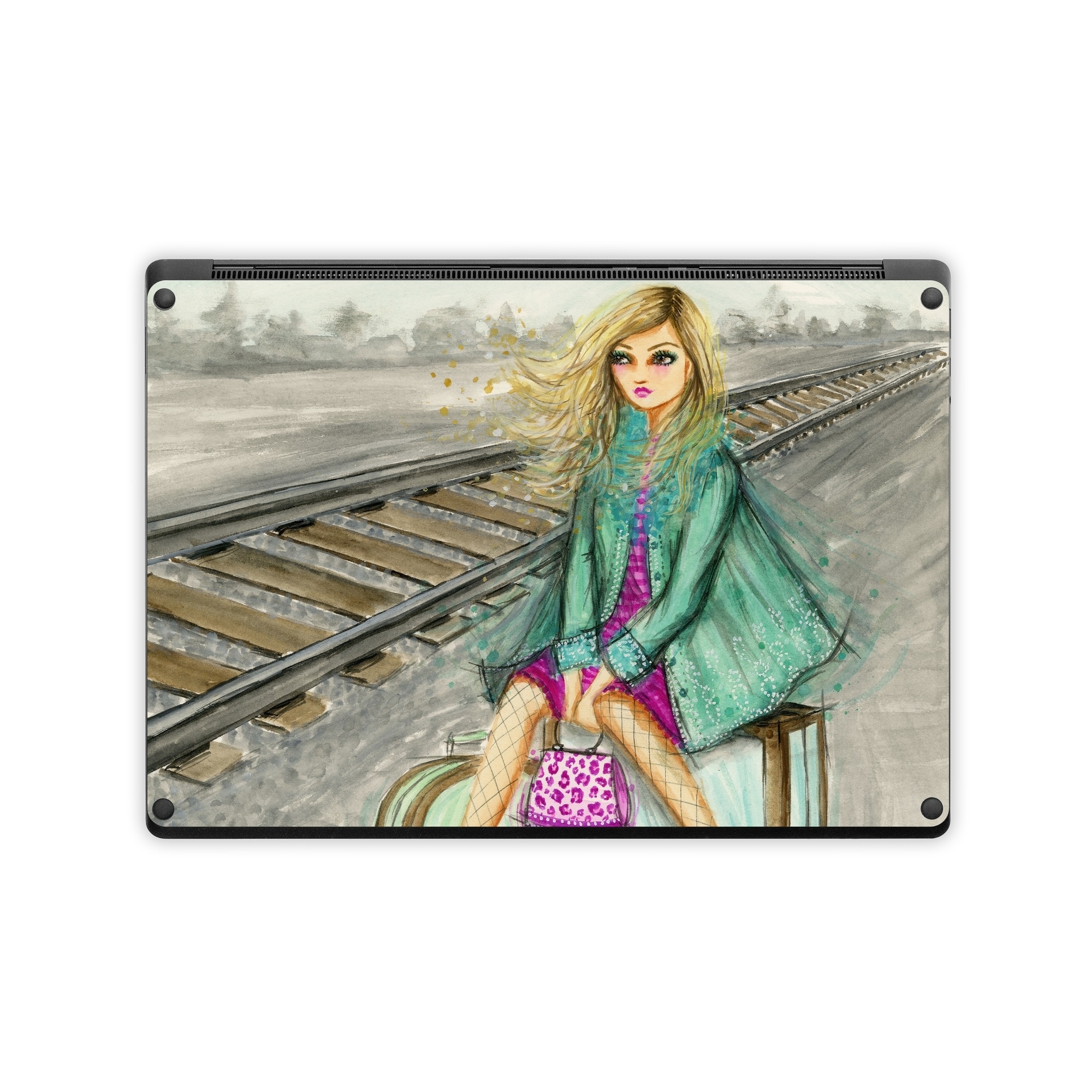 iStyles Microsoft Surface Laptop Series Skin design of Fashion illustration, Pink, Illustration, Fashion, Watercolor paint, Art, Magenta, Fashion design, Sitting, Drawing, with gray, green, pink, white, yellow, purple, blue colors, and tagged with people, fineart, objects, urban, drawn, fashion, girl, handdrawn, travel, woman, rails, bag, luggage.