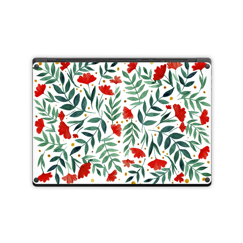 iStyles Microsoft Surface Laptop Series Skin design of Flower, Plant, Textile, Line, Petal, Pattern, Flowering plant, Pedicel, Creative arts, Rectangle, with red, green, orange, white colors, and tagged with flowers, patterns, nature, flowers, leaves.