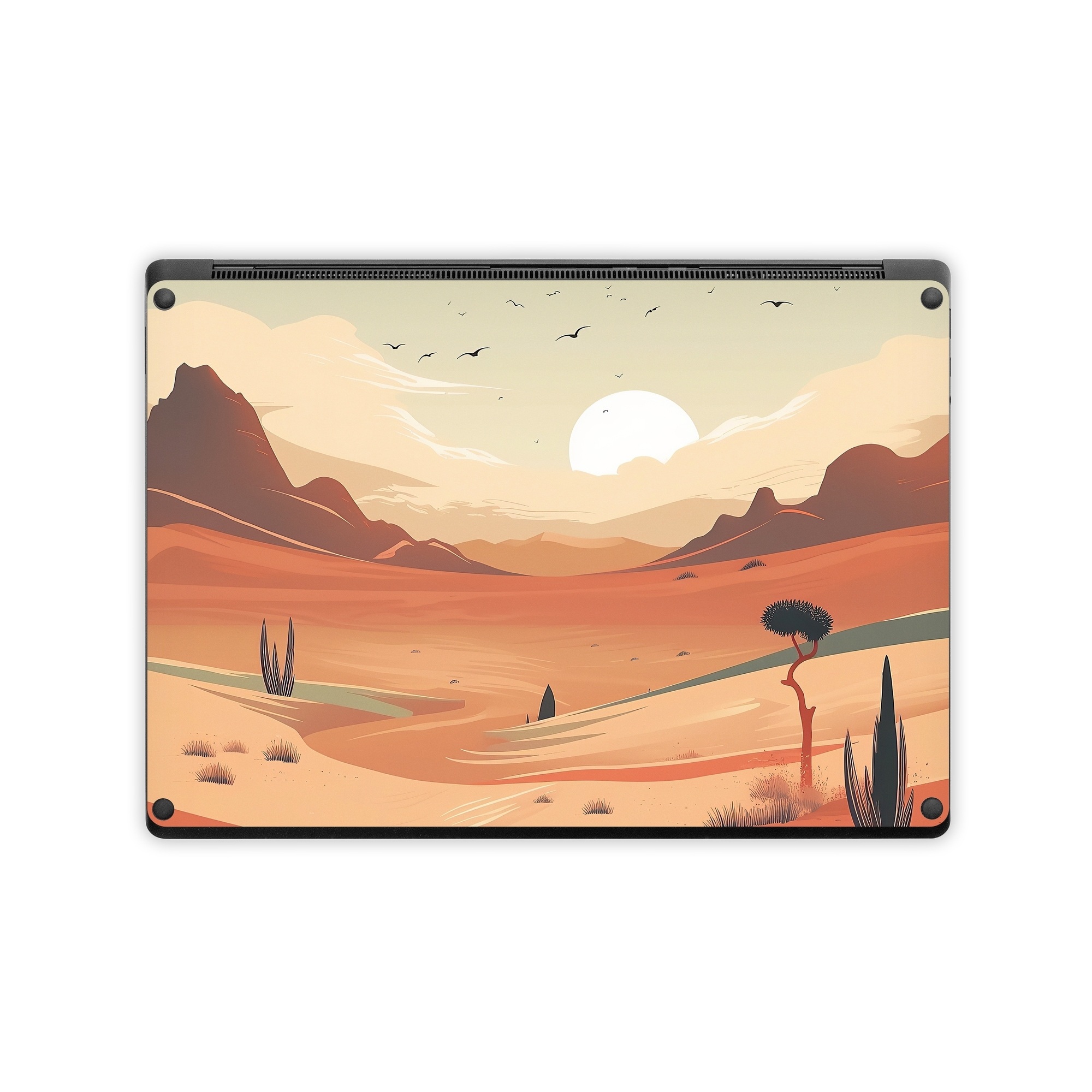iStyles Microsoft Surface Laptop Series Skin design of Sky, Bird, Ecoregion, Light, Nature, Cloud, Natural environment, Moon, Natural landscape, Biome, with orange, yellow, brown, green, white, black colors, and tagged with nature, animals, desert, landscape, distance, birds, sunset, sand.