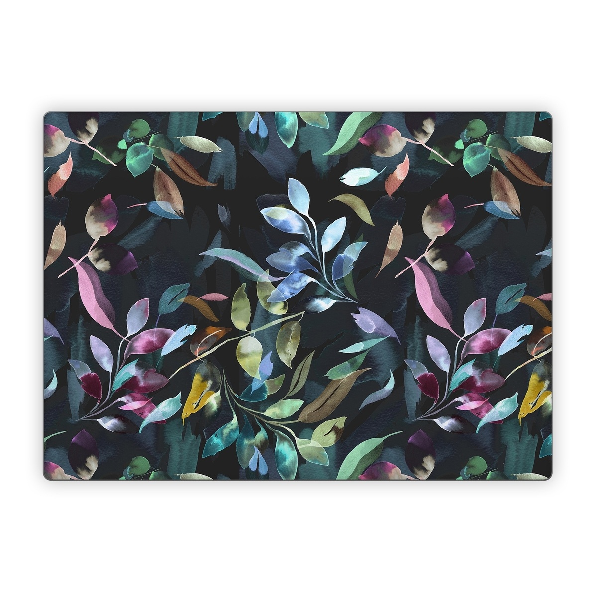 iStyles Microsoft Surface Laptop Series Skin design of Flower, Leaf, Plant, Botany, Organism, Line, Art, Petal, Groundcover, Terrestrial plant, with black, blue, green, purple, pink, red, white colors, and tagged with patterns, nature, leaves, fall, pattern.