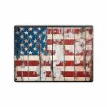 iStyles Microsoft Surface Laptop Series Skin design of Flag of the united states, World, Rectangle, Textile, Line, Wall, Flag, Symmetry, Tints and shades, Pattern, with red, blue, white, brown, gray, black colors, and tagged with flags, patterns, signs, united, states, flag, wooden, panels, stars, stripes, worn.