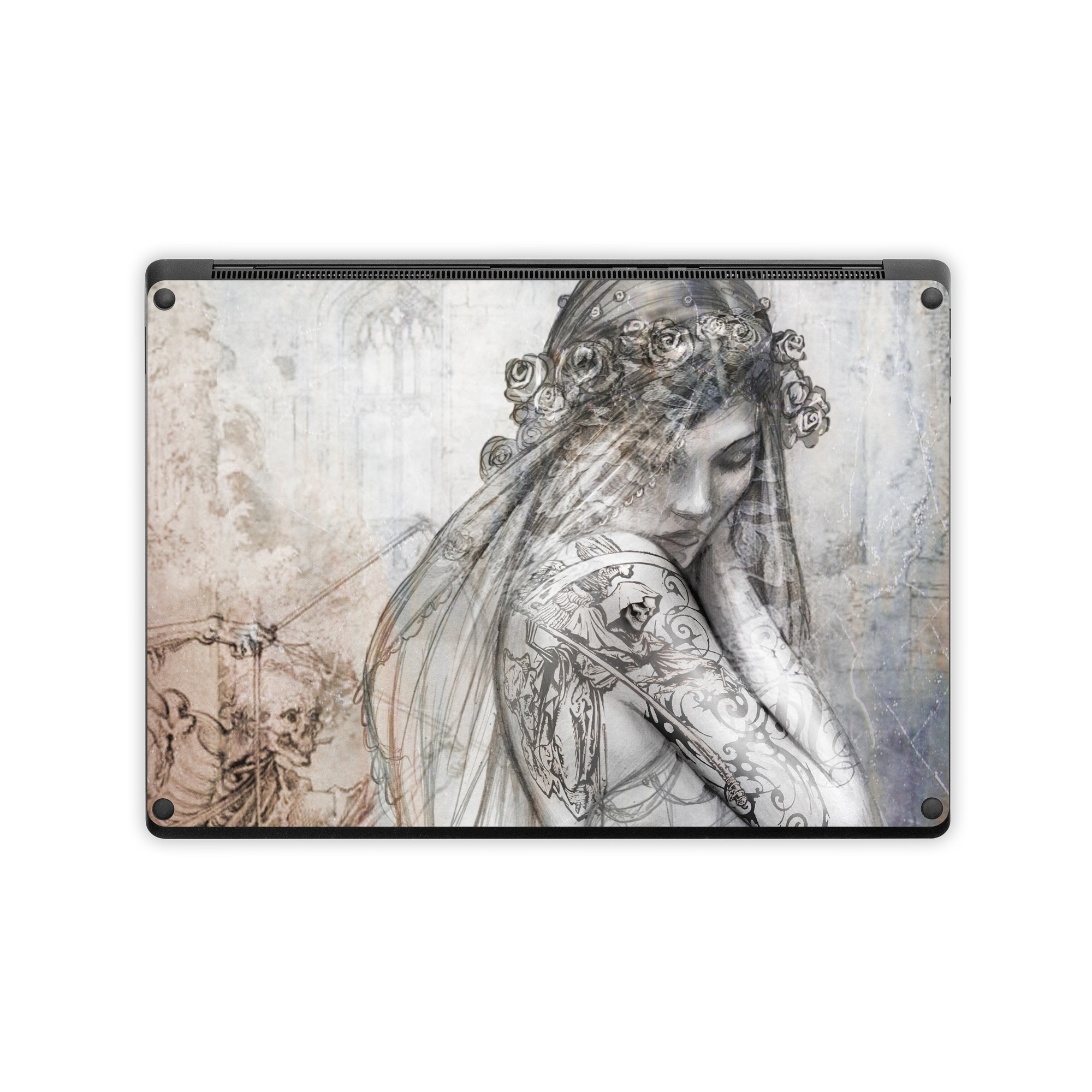 iStyles Microsoft Surface Laptop Series Skin design of Lady, Art, Illustration, Drawing, Painting, Sketch, Mythology, Figure drawing, Long hair, Visual arts, with white, gray, black colors, and tagged with skulls, people, flowers, fantasy, death, ghost, goth, gothic, scythe, skull, tattoo.