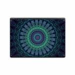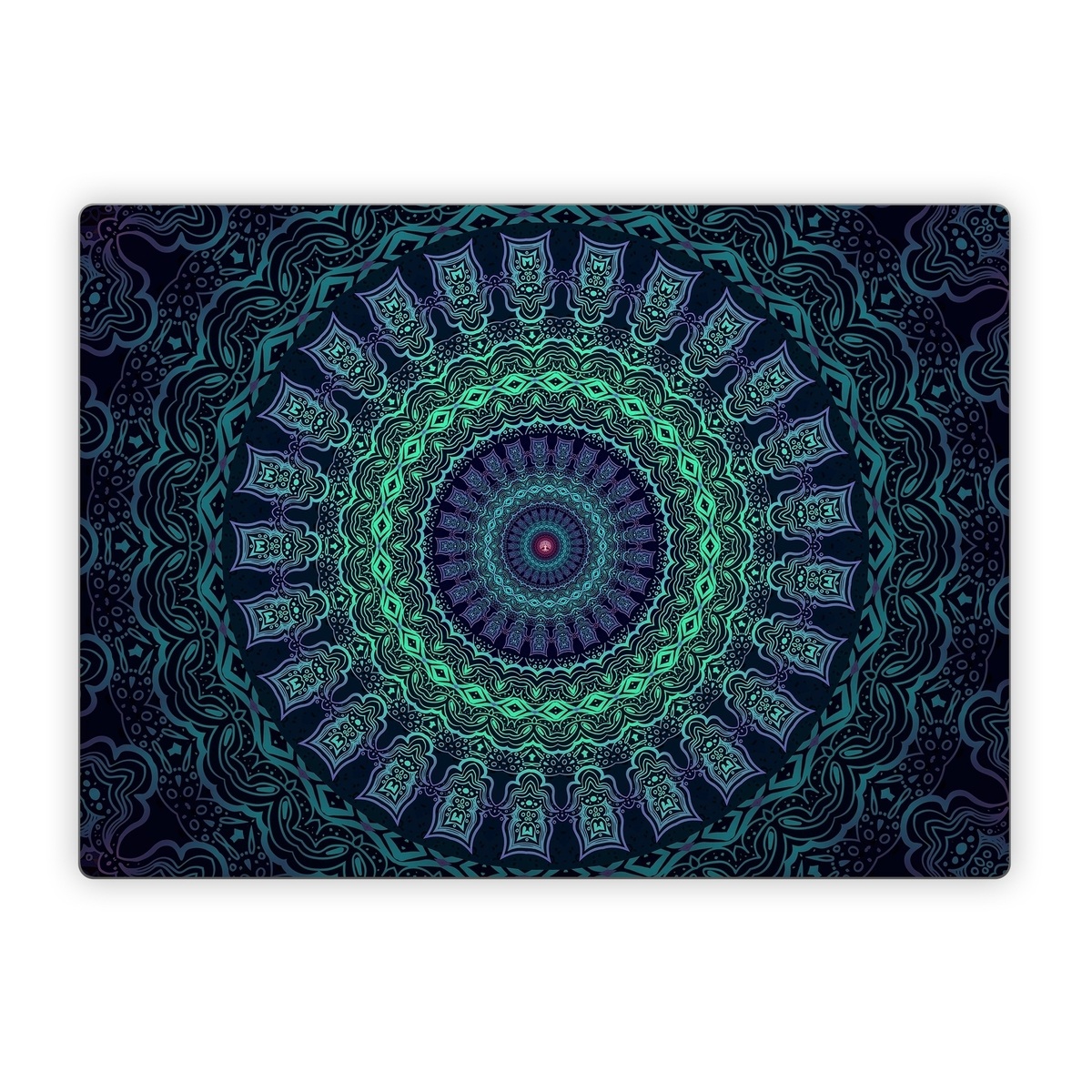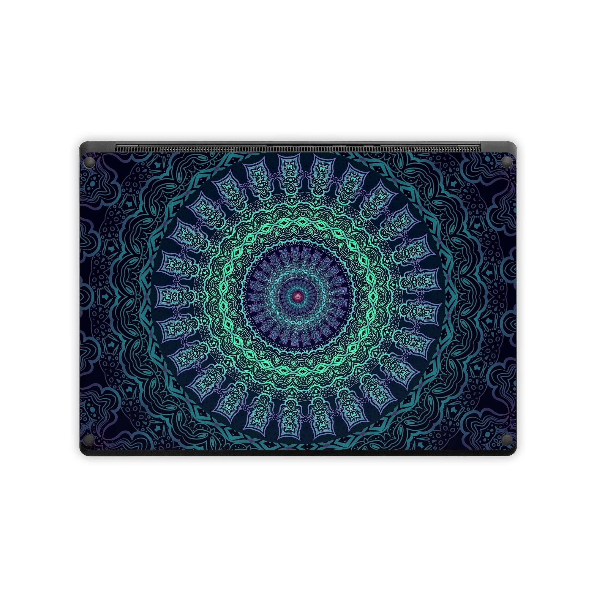 iStyles Microsoft Surface Laptop Series Skin design of Colorfulness, Blue, Green, Pattern, Teal, Turquoise, Art, Electric Blue, Aqua, Circle, Majorelle Blue, Visual Arts, Fractal Art, Design, Symmetry, Psychedelic Art, Graphics, Kaleidoscope, Motif, with black, green, red colors, and tagged with patterns, fractals, balance, blue, circle, green, mandala, neon, purple, rainbow, symmetry.