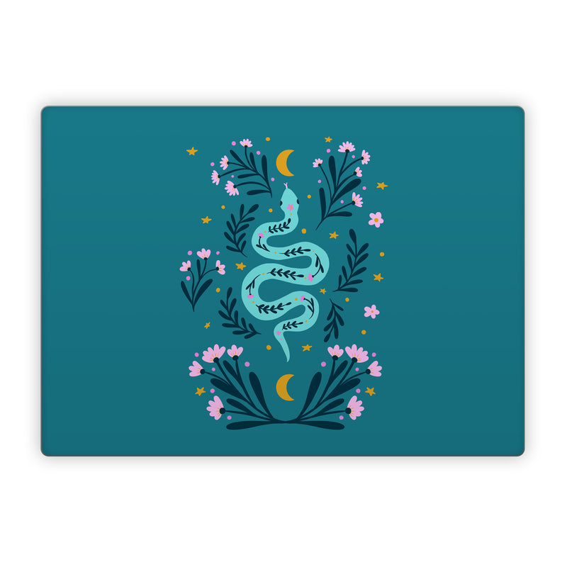 iStyles Microsoft Surface Laptop Series Skin design of Creative arts, Font, Art, Electric blue, Pattern, Rectangle, Graphics, Motif, Illustration, Ornament, with blue, pink, green, yellow colors, and tagged with animals, flowers, nature, space, snake, flowers, moon, stars, night, sky, constellations.