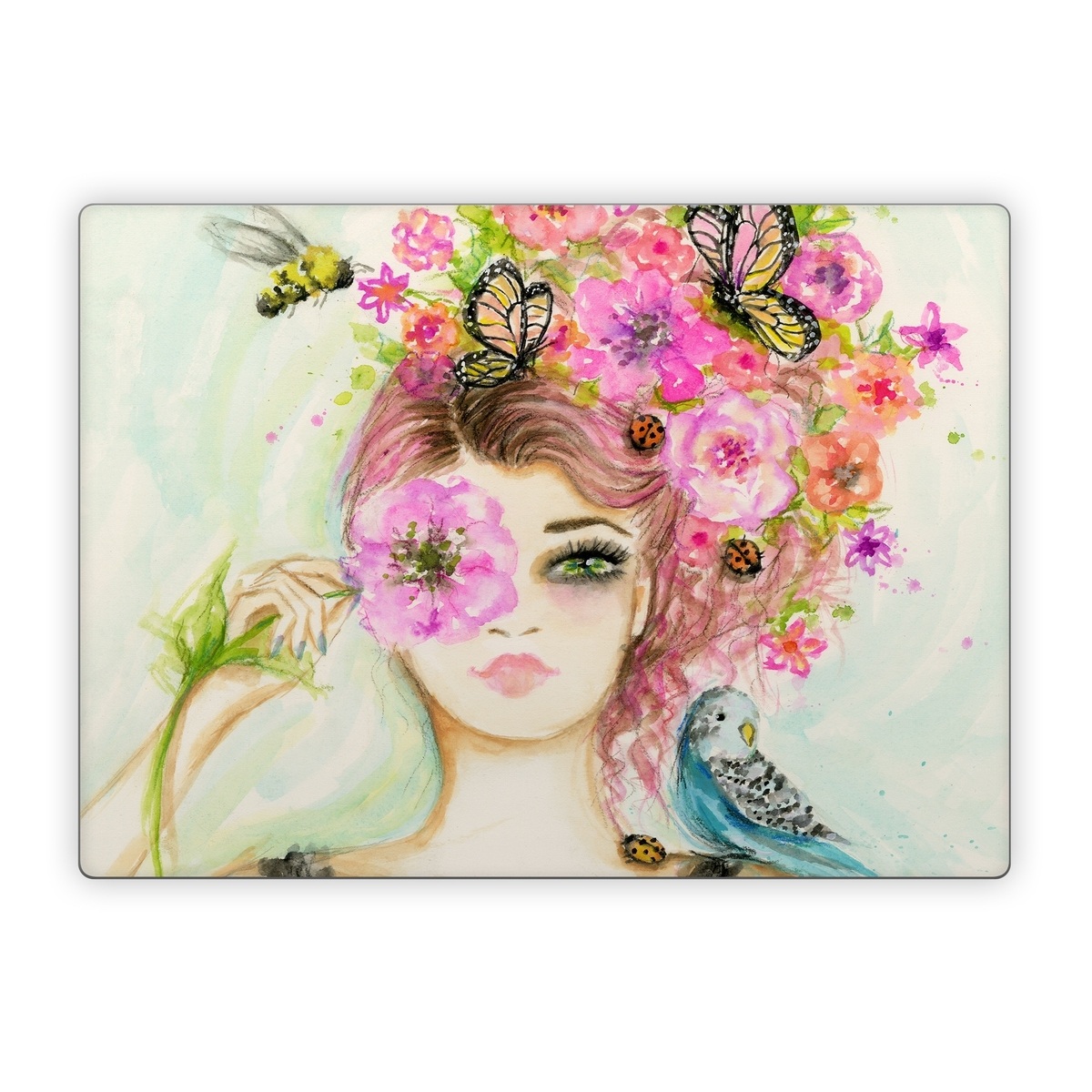 iStyles Microsoft Surface Laptop Series Skin design of Face, Watercolor paint, Illustration, Pink, Head, Fashion illustration, Beauty, Art, Cheek, Painting, with white, pink, green, blue, yellow, red, brown colors, and tagged with people, fineart, objects, animals, flowers, nature, drawn, floral, flower, flowers, girl, handdrawn, nature, pastel, portrait, woman, bird, bee, butterfly.
