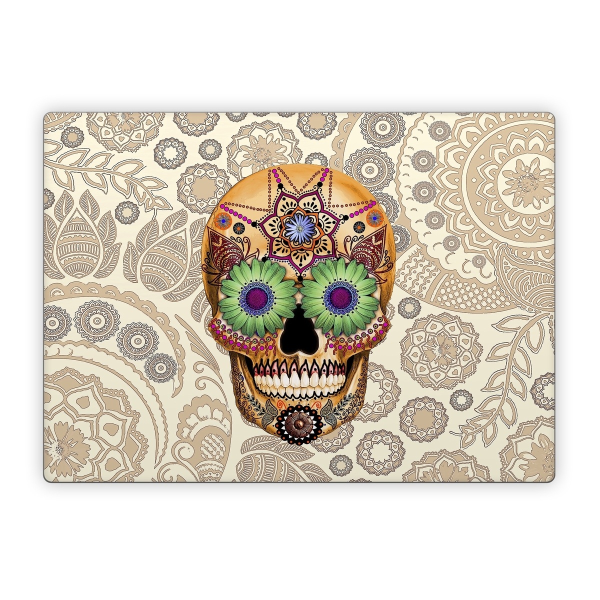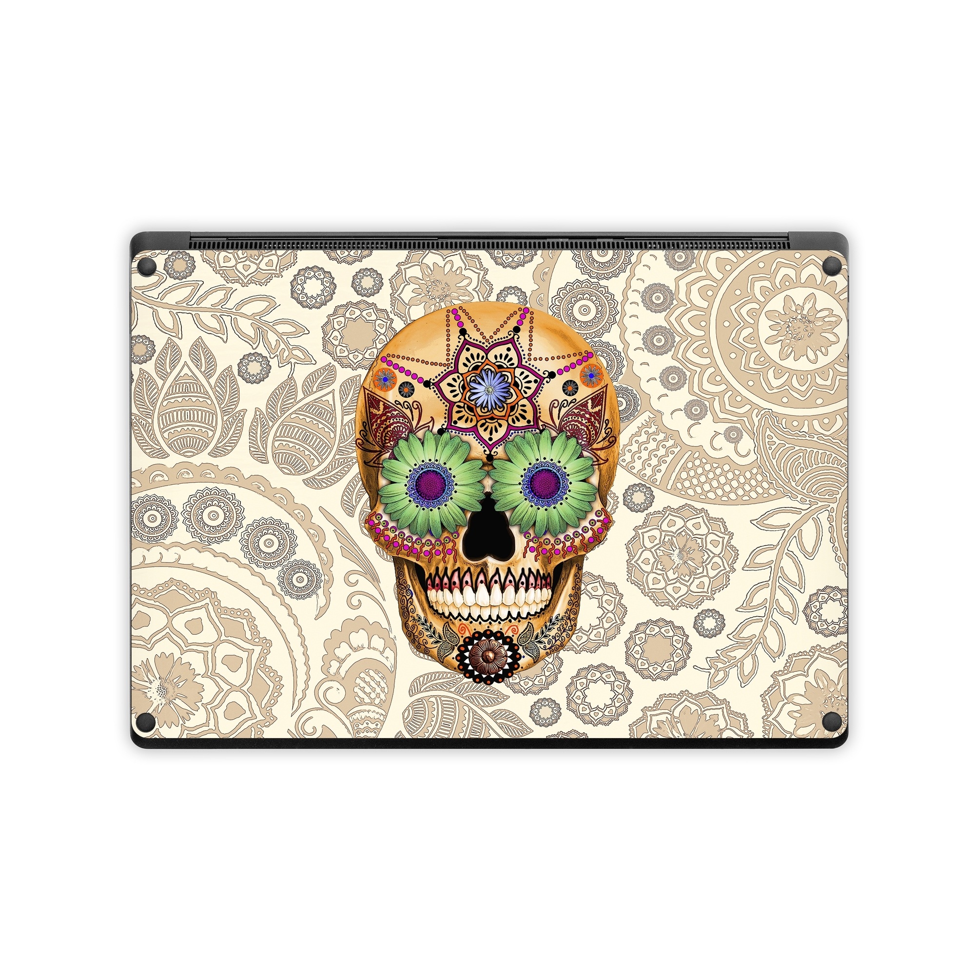 iStyles Microsoft Surface Laptop Series Skin design of Skull, Bone, Pattern, Design, Illustration, Visual arts, Fashion accessory, Art, with gray, yellow, green, black, red, pink colors, and tagged with patterns, skulls, flowers, nature.