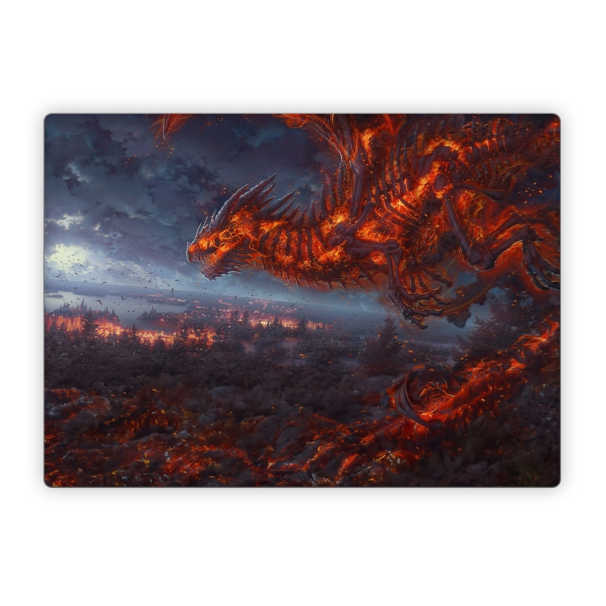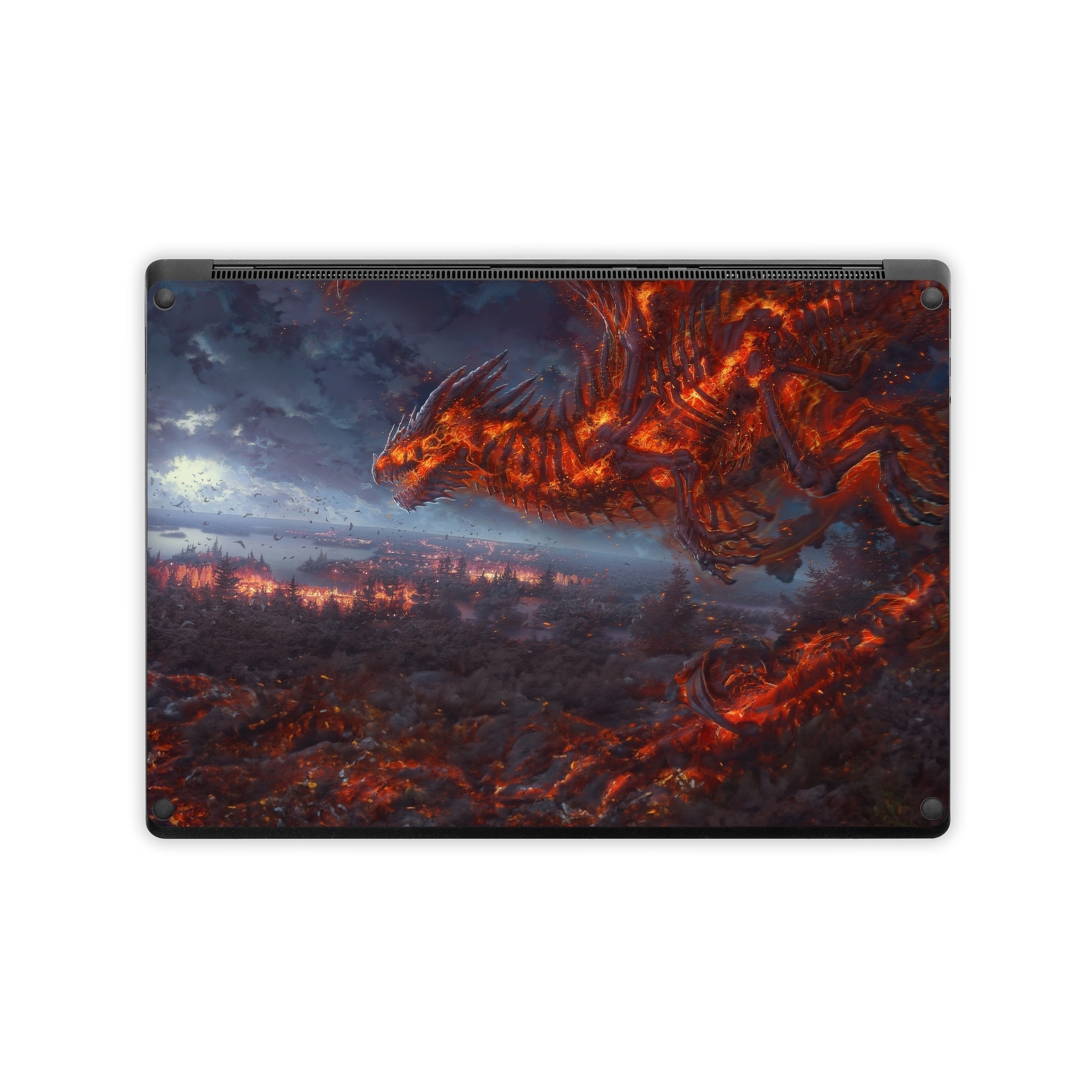 iStyles Microsoft Surface Laptop Series Skin design of Geological phenomenon, Dragon, Cg artwork, Sky, Flame, Fictional character, Mythology, Lava, Demon, Heat, with red, blue, black colors, and tagged with fantasy, animals, nature, dragon, fire, flame, monster, skeleton.