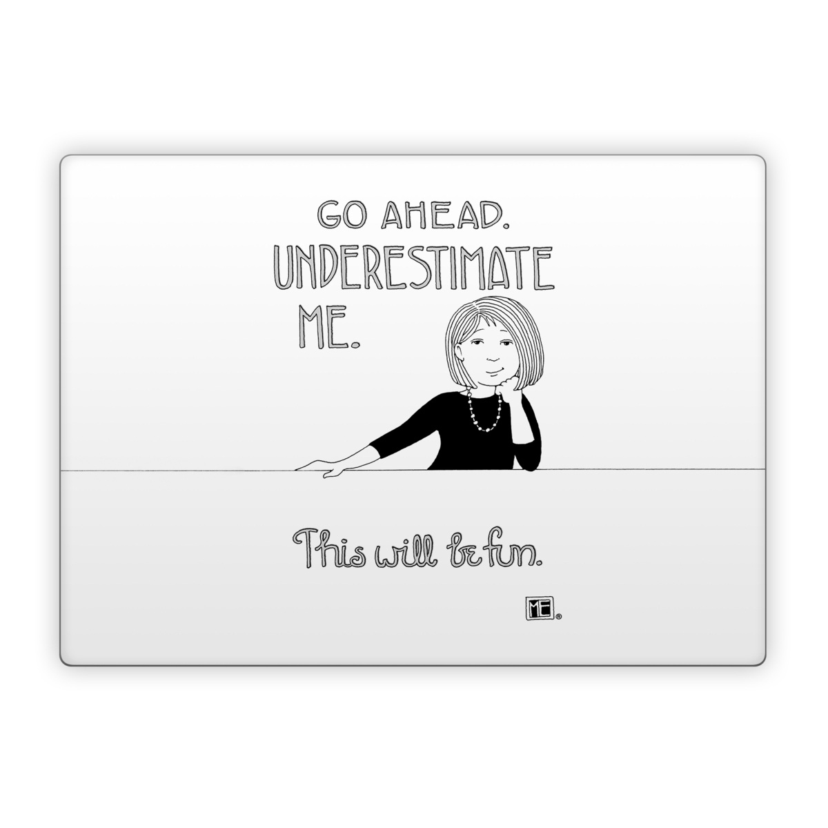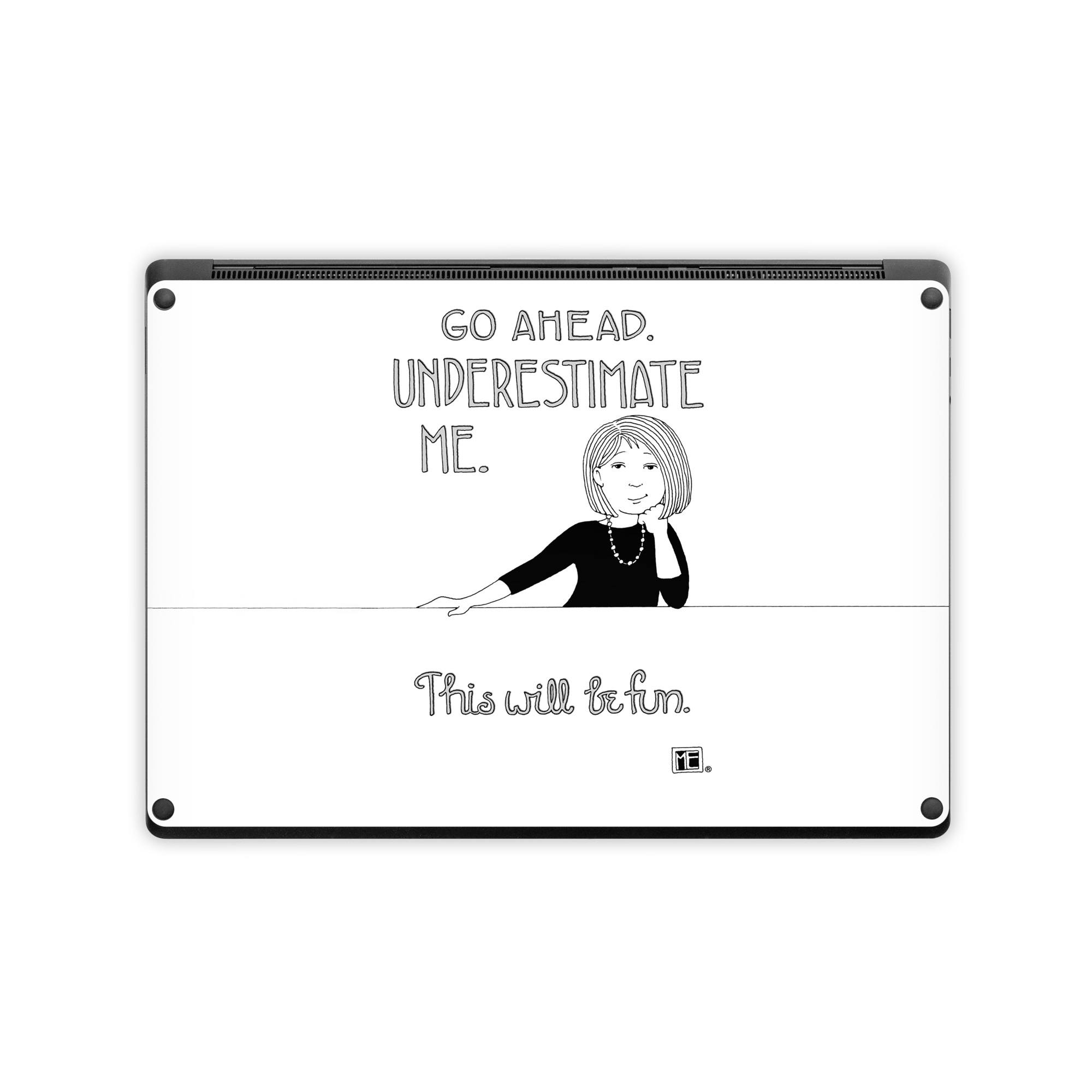 iStyles Microsoft Surface Laptop Series Skin design of Gesture, Happy, Font, Illustration, Poster, Line art, Graphics, Art, Logo, Graphic design, with black, white colors, and tagged with signs, people, confidence, attitude, go, ahead, underestimate, me, this, will, be, fun.