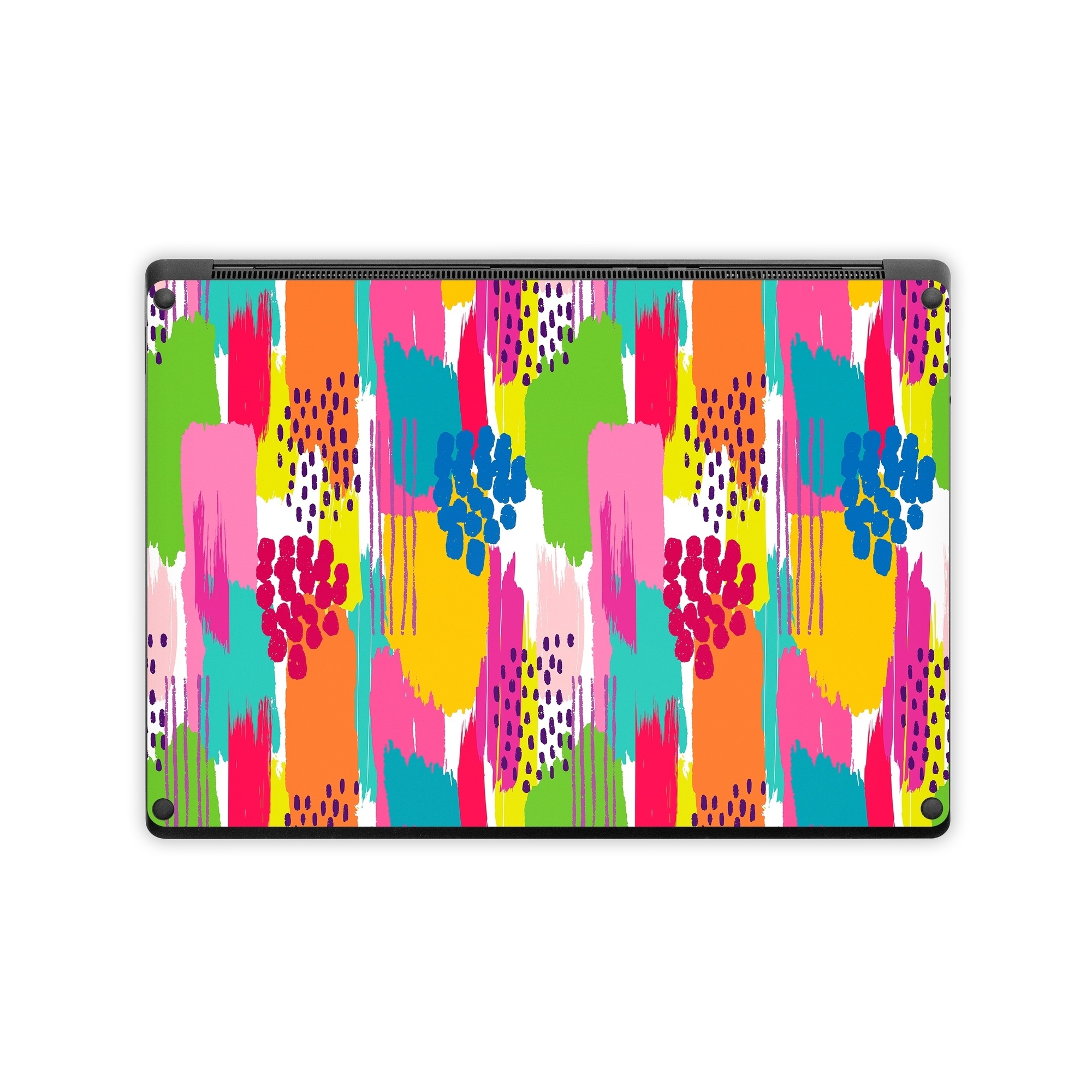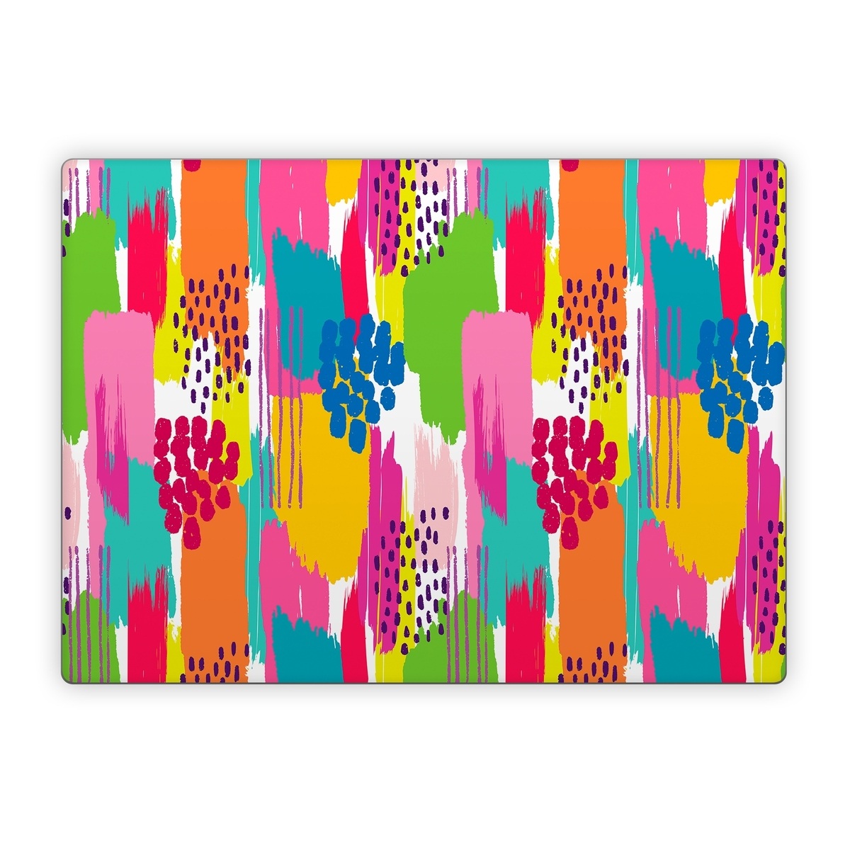 iStyles Microsoft Surface Laptop Series Skin design of Colorfulness, Textile, Rectangle, Font, Line, Painting, Art, Magenta, Material property, Pattern, with white, pink, yellow, orange, blue, red colors, and tagged with patterns, abstract, brush, brushstrokes, dots, lines, paint, splatter.