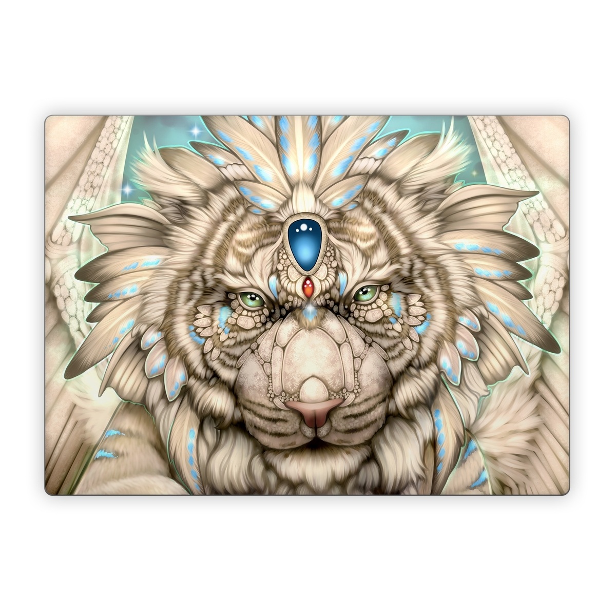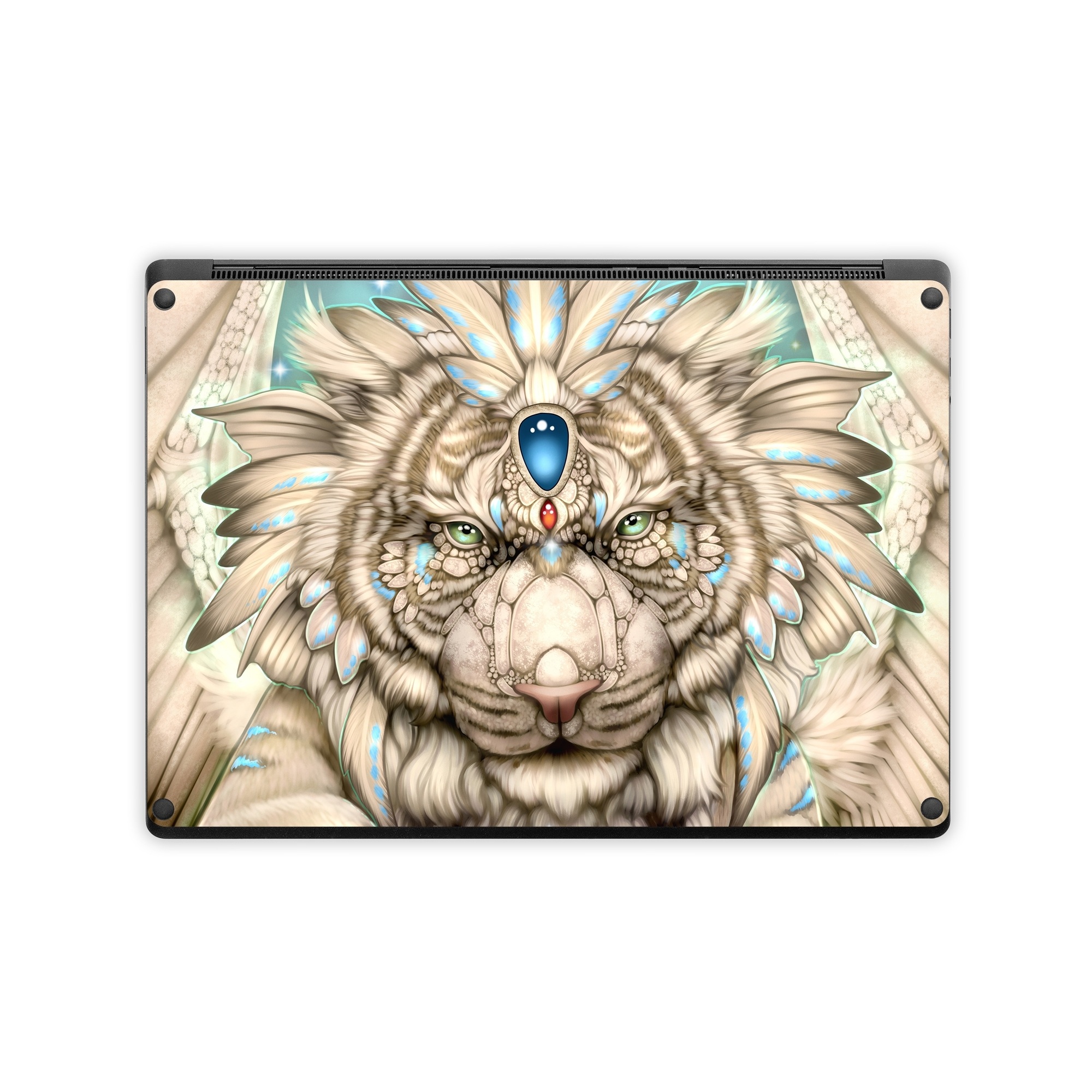 iStyles Microsoft Surface Laptop Series Skin design of Mythical creature, Sleeve, Textile, Gesture, Felidae, Tattoo, Big cats, Font, Temporary tattoo, Painting, with white, blue, black, gray colors, and tagged with fantasy, animals, objects, white, tiger, wings.