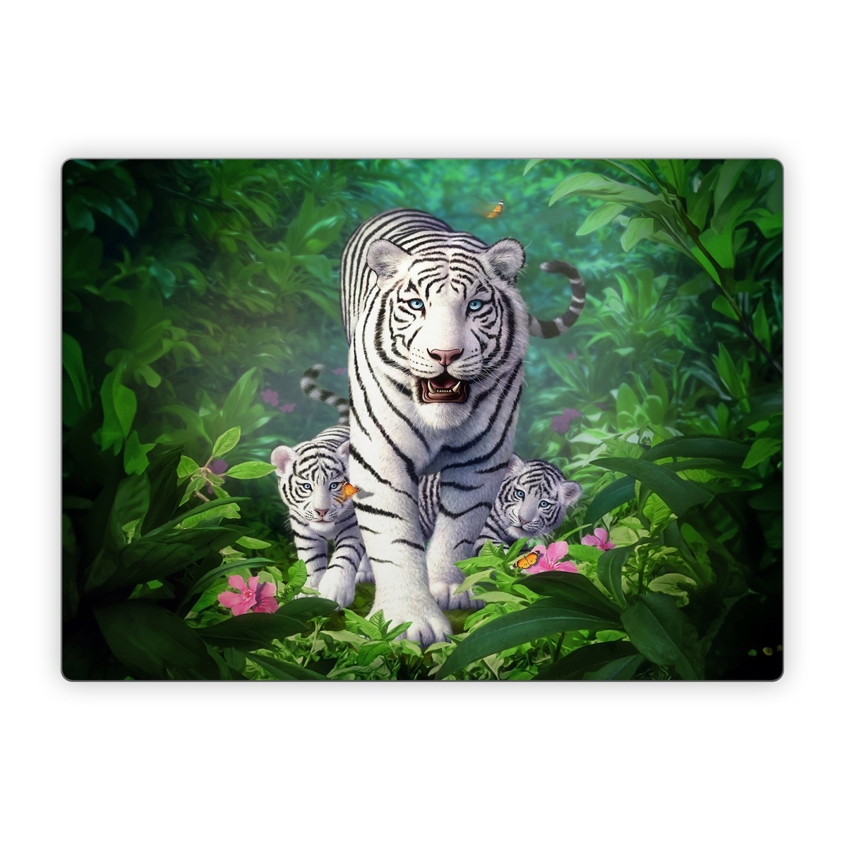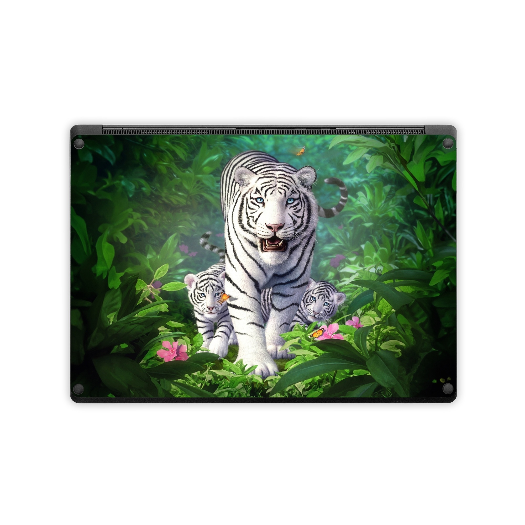 iStyles Microsoft Surface Laptop Series Skin design of Plant, Eye, Plant community, Vertebrate, Felidae, Leaf, Botany, Carnivore, Organism, Terrestrial plant, with white, black, blue, green, pink, yellow colors, and tagged with animals, nature, animal, animals, cub, cubs, green, jungle, outdoor, tiger, tigers, white.