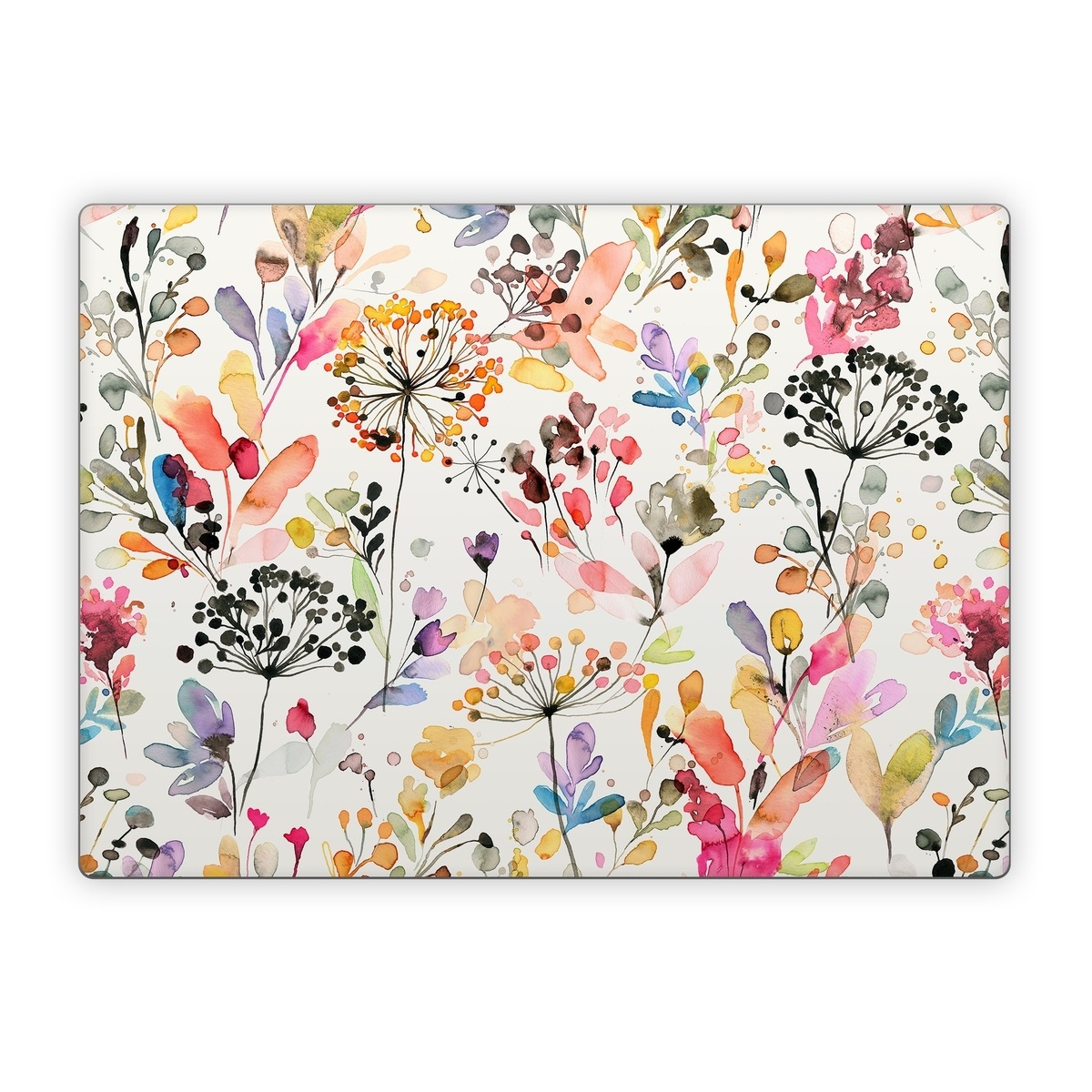 iStyles Microsoft Surface Laptop Series Skin design of Flower, Petal, Rectangle, Branch, Creative arts, Plant, Line, Art, Painting, Font, with white, pink, red, yellow, orange, green, blue, purple colors, and tagged with patterns, flowers, nature, flower, flowers, garden, grass, nature, outdoors, watercolor.