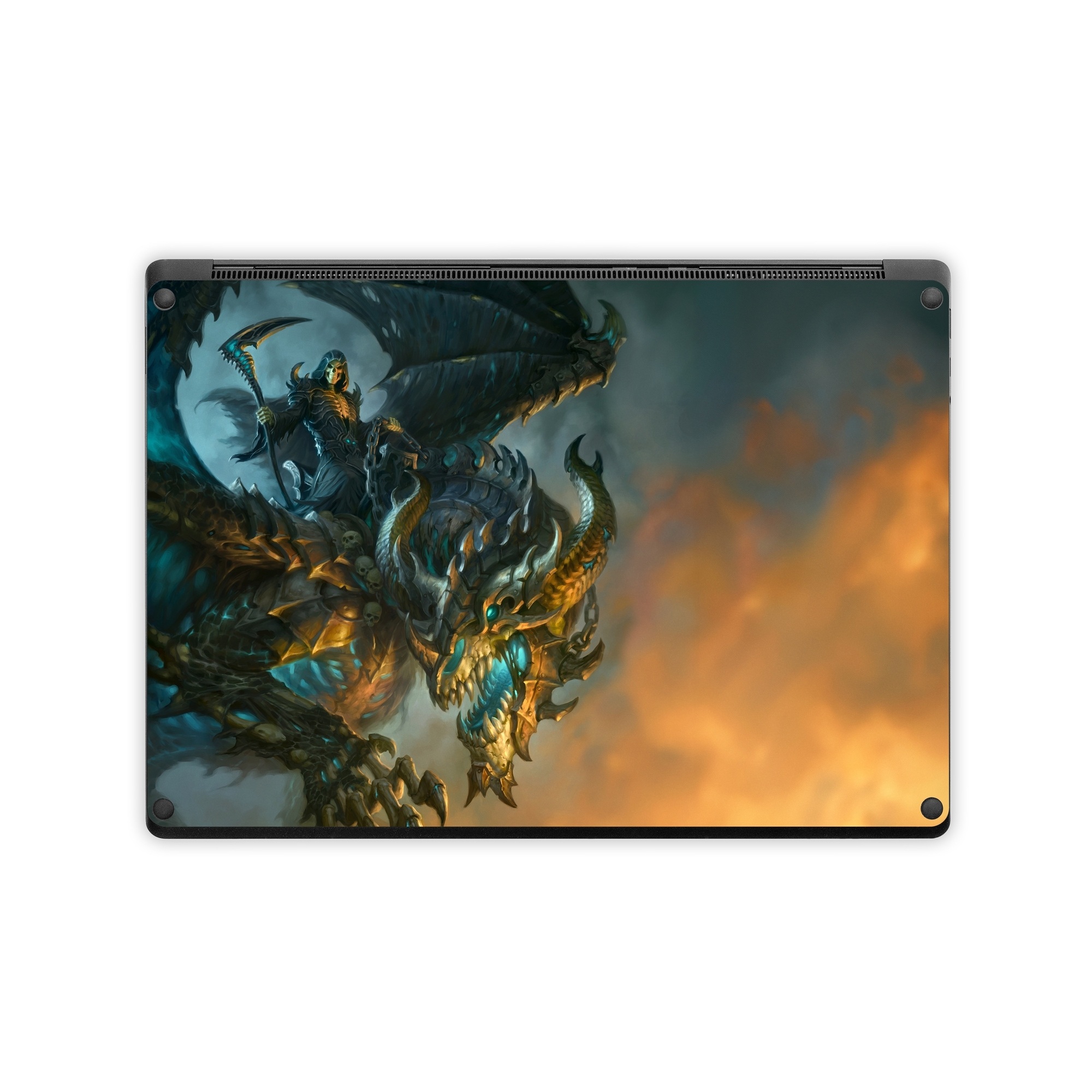 iStyles Microsoft Surface Laptop Series Skin design of Dragon, Cg artwork, Fictional character, Mythical creature, Demon, Mythology, Illustration, Cryptid, Art, with orange, yellow, black, brown, blue, white colors, and tagged with fantasy, animals, skulls, people, objects, bones, death, dragon, fire, grimreaper, skeleton.