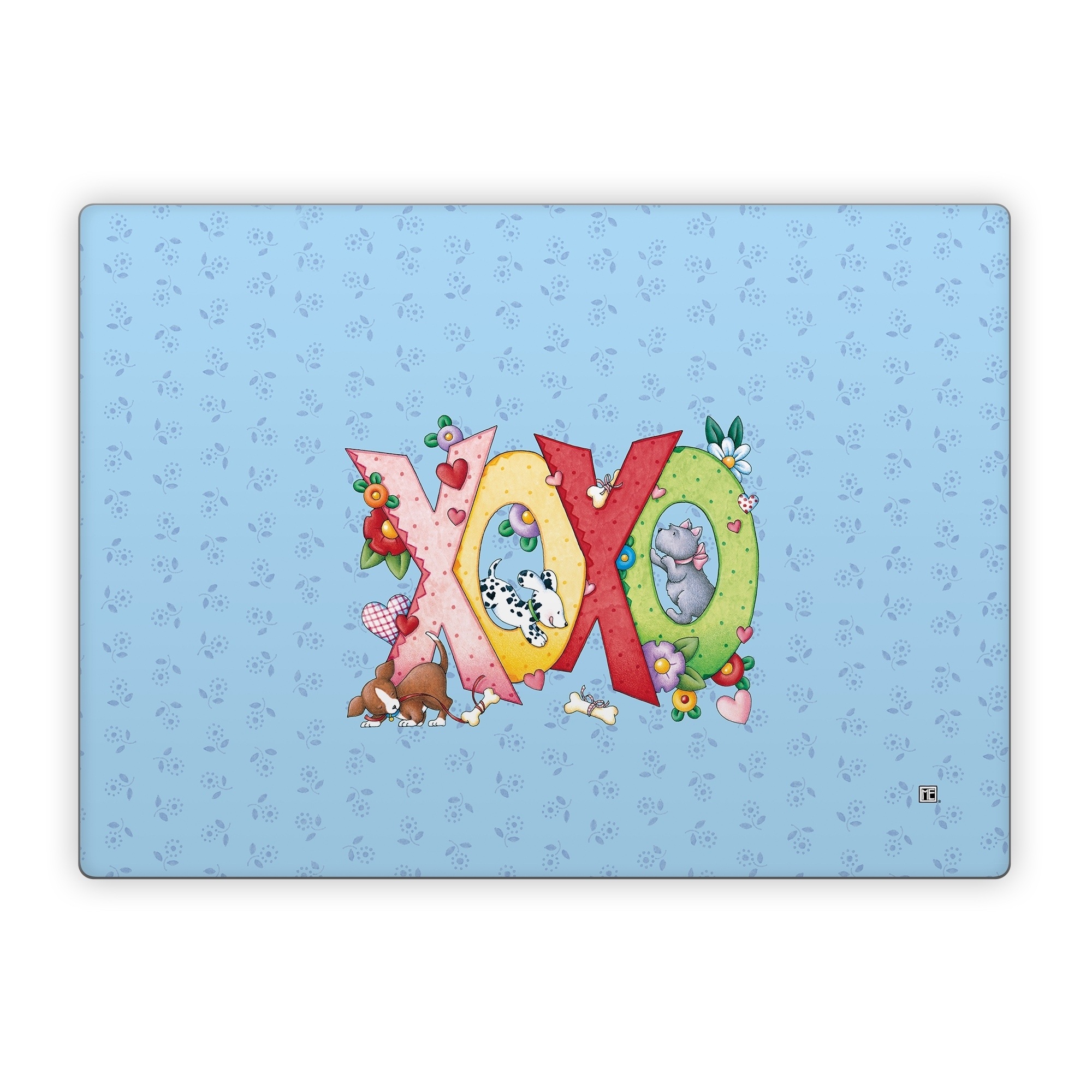 iStyles Microsoft Surface Laptop Series Skin design of Rectangle, Font, Creative arts, Art, Pattern, Happy, Illustration, Circle, Graphics, Visual arts, with blue, pink, yellow, red, green, orange, brown, white, black colors, and tagged with animals, signs, hearts, flowers, patterns, xoxo, love, valentine, puppies, dogs, dalmatians, hearts, flowers.