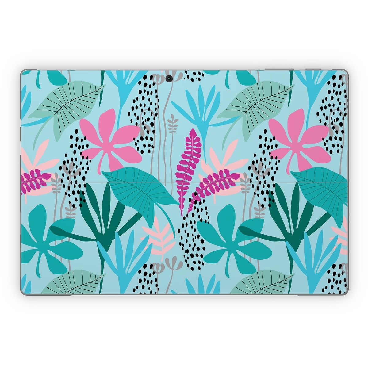iStyles Microsoft Surface Pro Series Skin design of White, Leaf, Botany, Green, Textile, Branch, Organism, Plant, Font, Pink, with blue, green, pink, purple, black, gray colors, and tagged with patterns, flowers, nature, flowers, leaves, nature.