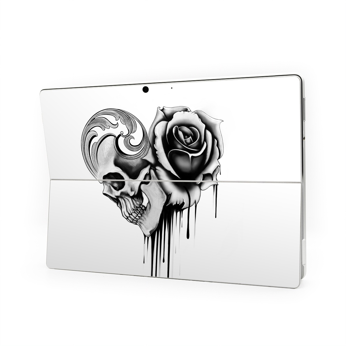 iStyles Microsoft Surface Pro Series Skin design of Black-and-white, Illustration, Monochrome, Rose, Plant, Style, Metal, Drawing, with white, black, gray colors, and tagged with hearts, flowers, skulls, goth, gothic, heart, ink, inkpen, rose, sketch, skull.