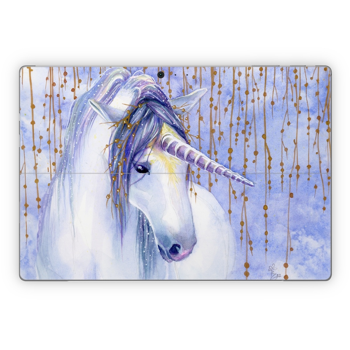 iStyles Microsoft Surface Pro Series Skin design of Horse, Eyelash, Painting, Working animal, Line, Art, Paint, Snout, Pack animal, Illustration, with white, purple, brown, yellow colors, and tagged with animals, fantasy, unicorn, tiara, horn.