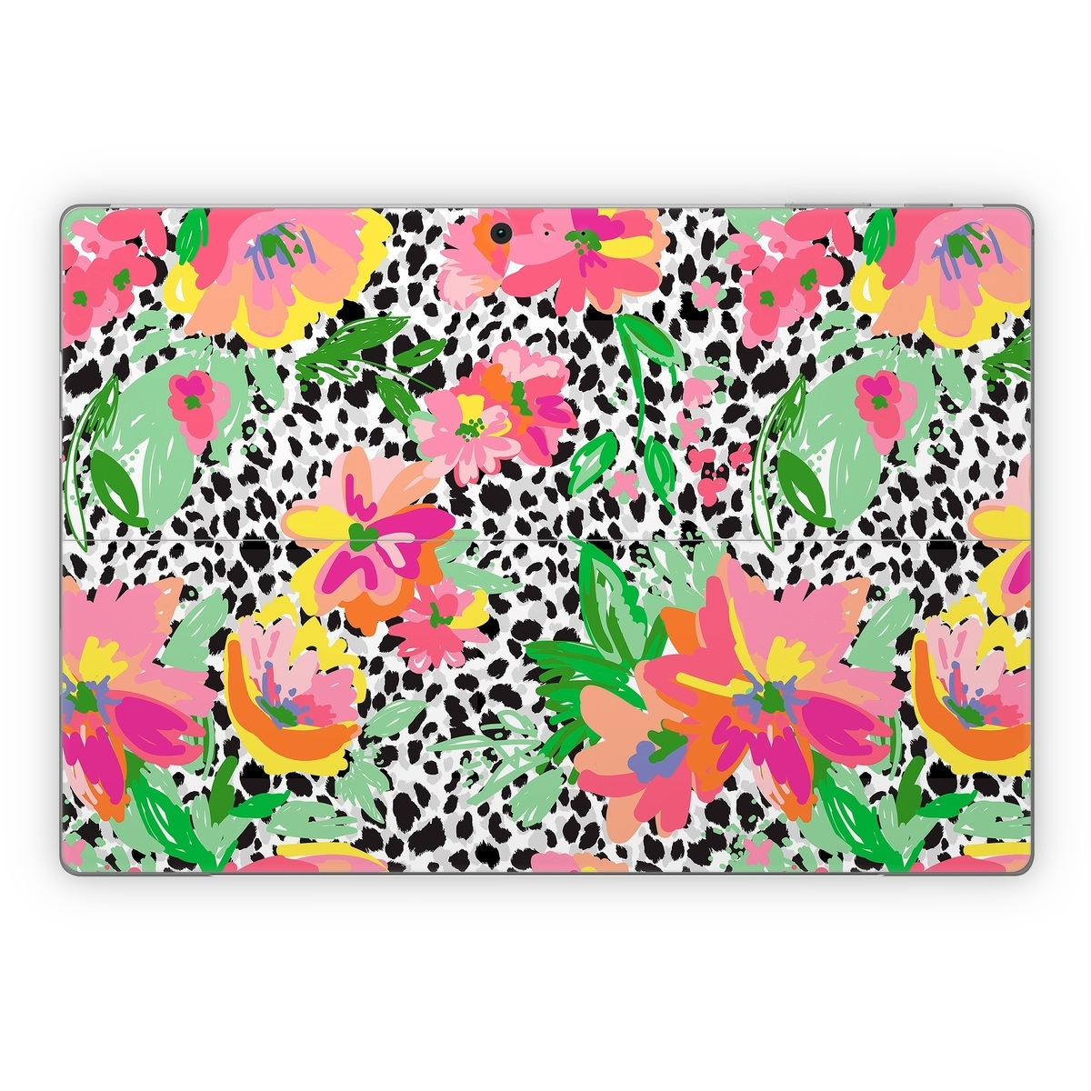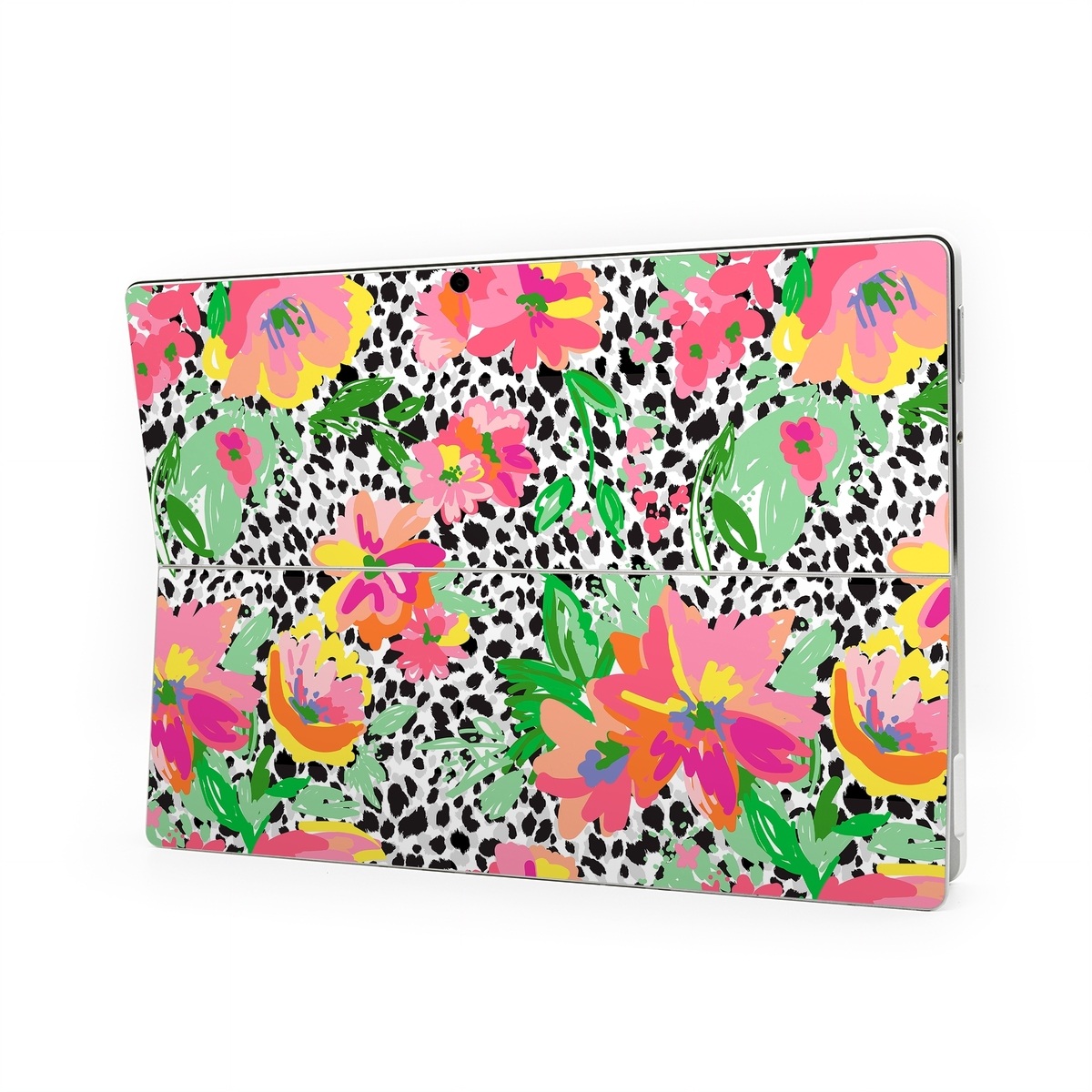 iStyles Microsoft Surface Pro Series Skin design of Flower, Petal, Textile, Pink, Creative arts, Art, Magenta, Pattern, Plant, Symmetry, with pink, orange, yellow, purple, green, black, white colors, and tagged with patterns, flowers, flowers, leaves, arrangement.
