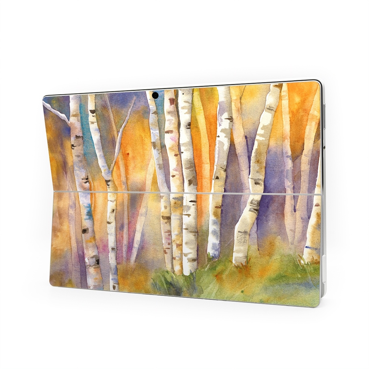 iStyles Microsoft Surface Pro Series Skin design of Canoe birch, Watercolor paint, Tree, Birch, Woody plant, Painting, Plant, Birch family, Paint, Trunk, with orange, yellow, green, white, purple, blue colors, and tagged with nature.