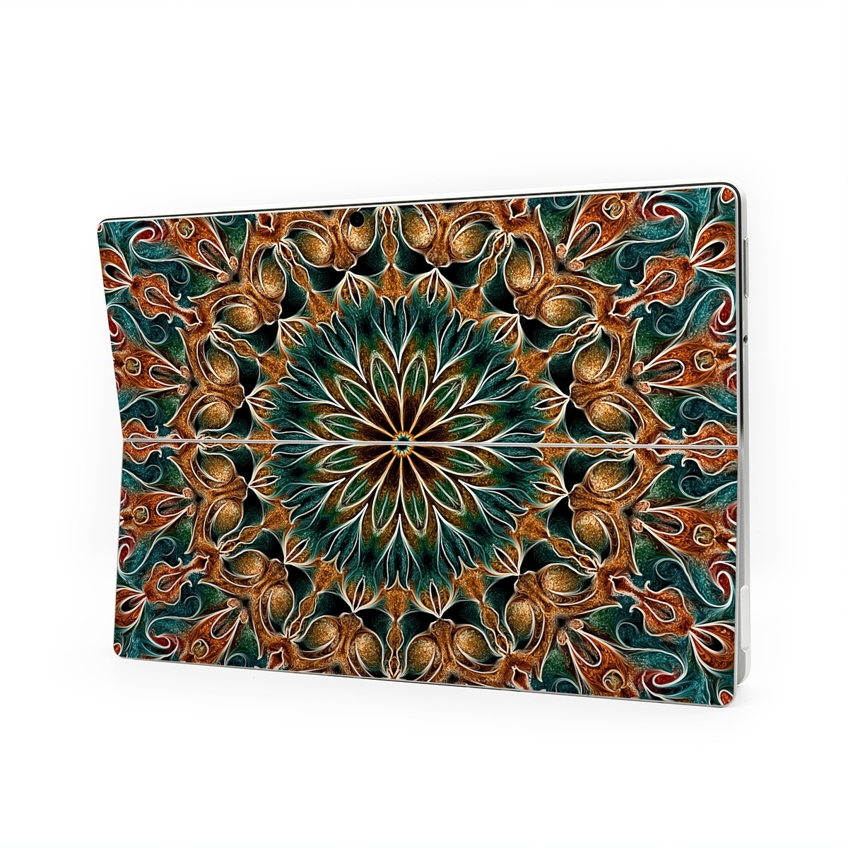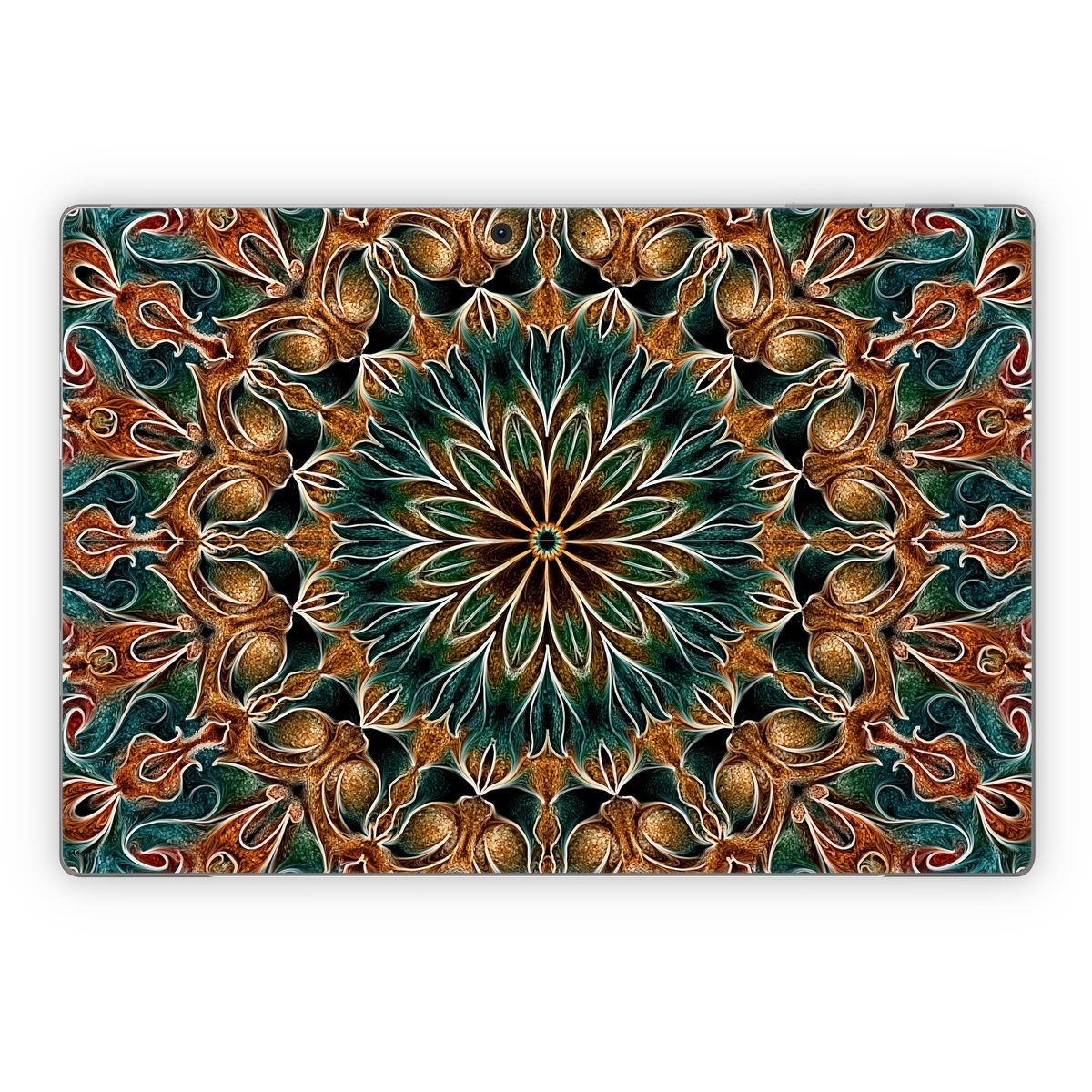 iStyles Microsoft Surface Pro Series Skin design of Pattern, Symmetry, Textile, Art, Psychedelic art, Tapestry, Design, Visual arts, Kaleidoscope, Motif, with green, orange, yellow, brown, red colors, and tagged with patterns, abstract, orange, teal.