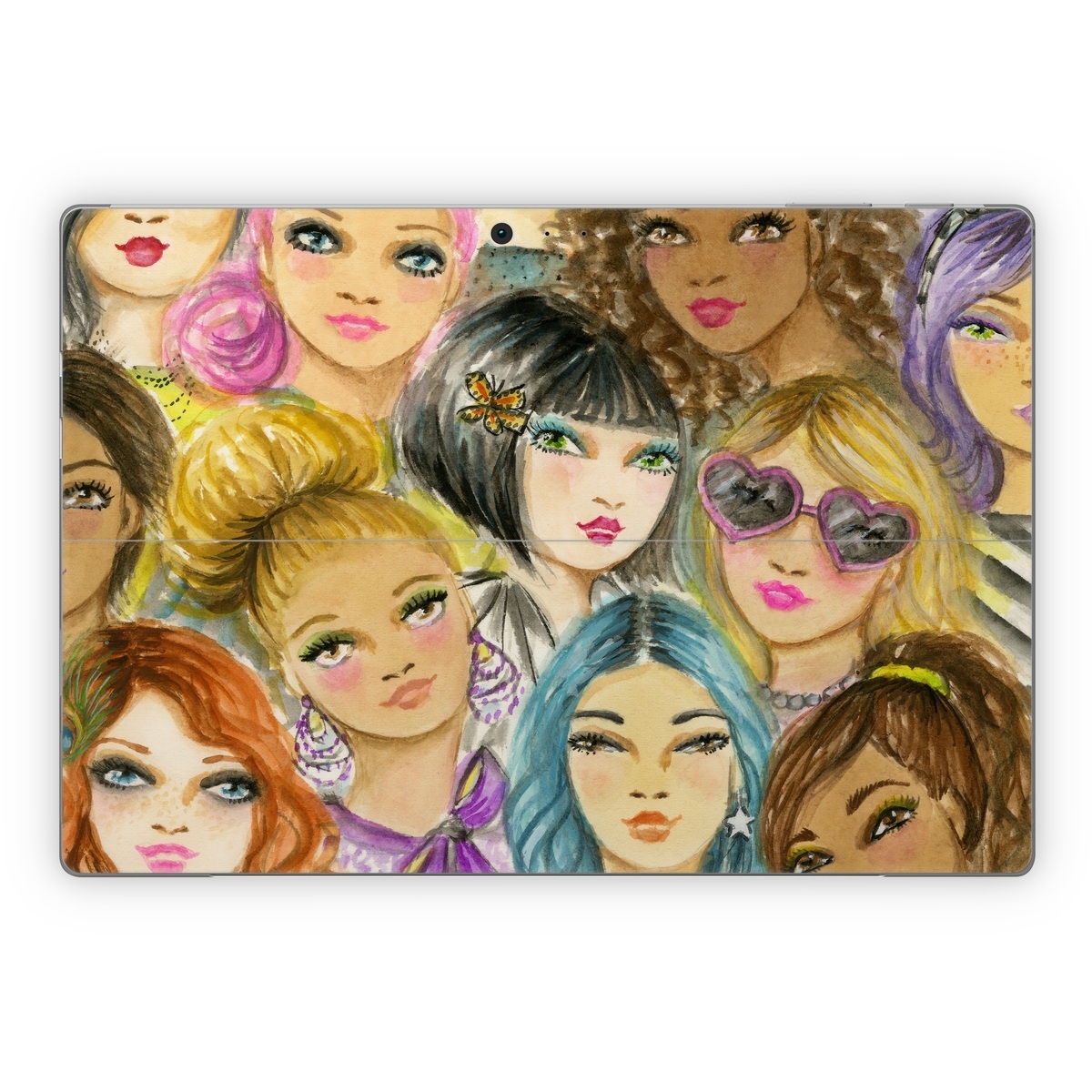 iStyles Microsoft Surface Pro Series Skin design of Face, Hair, Head, Art, Hair coloring, Cheek, Illustration, Human, Watercolor paint, Brown hair, with white, black, brown, yellow, purple, blue, pink colors, and tagged with people, fineart, flowers, drawn, face, faces, fashion, handdrawn, painting, portrait, woman, women, sunglasses, chinese, caucasian, black, eurasian, asian, european, african.