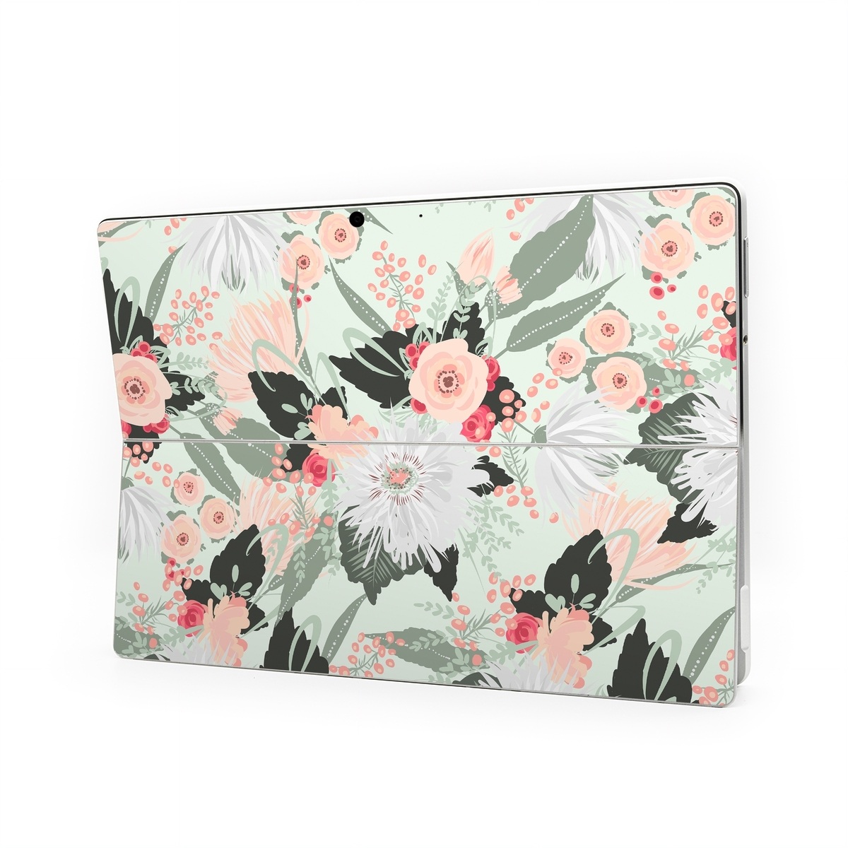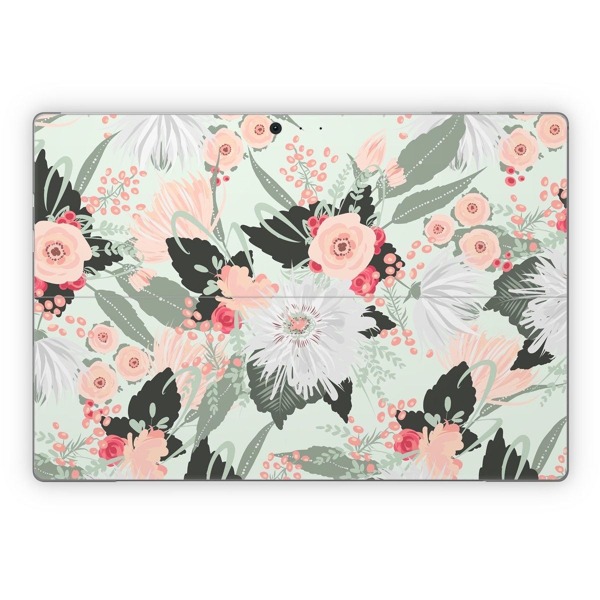 iStyles Microsoft Surface Pro Series Skin design of Pattern, Pink, Floral design, Design, Textile, Wrapping paper, Plant, Peach, Flower, with green, red, white, pink colors, and tagged with patterns, flowers, nature, bouquet, filigree, floral, flower, flowers, leaf, leaves, pastel.