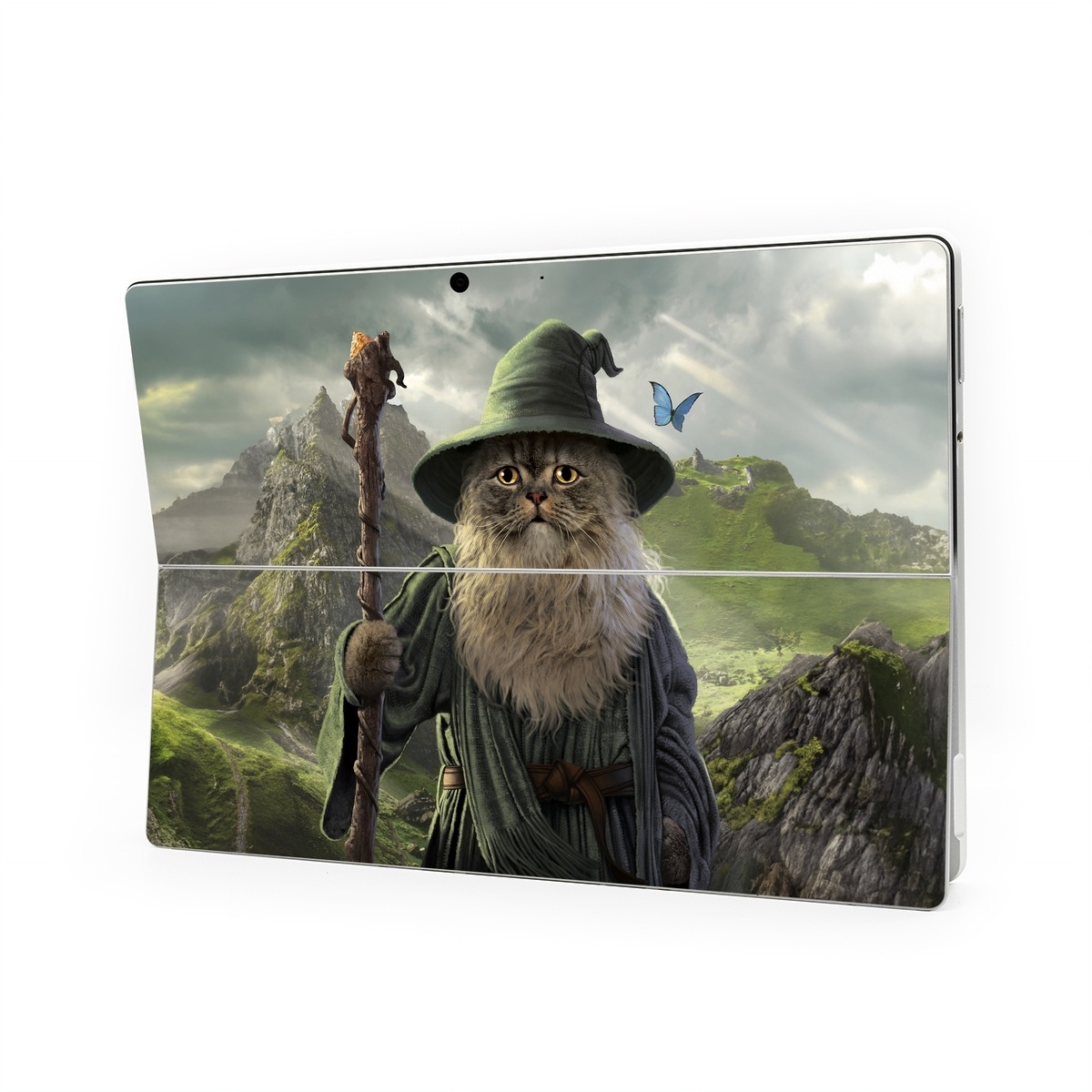 iStyles Microsoft Surface Pro Series Skin design of Beard, Facial hair, Illustration, Mythology, Magician, Fictional character, Cg artwork, Games, Art, with green, gray, brown, blue, green, white, yellow, black colors, and tagged with animals, fantasy, objects, cat, fantasy, middleearth, movie, movies, wizard, hat, staff.