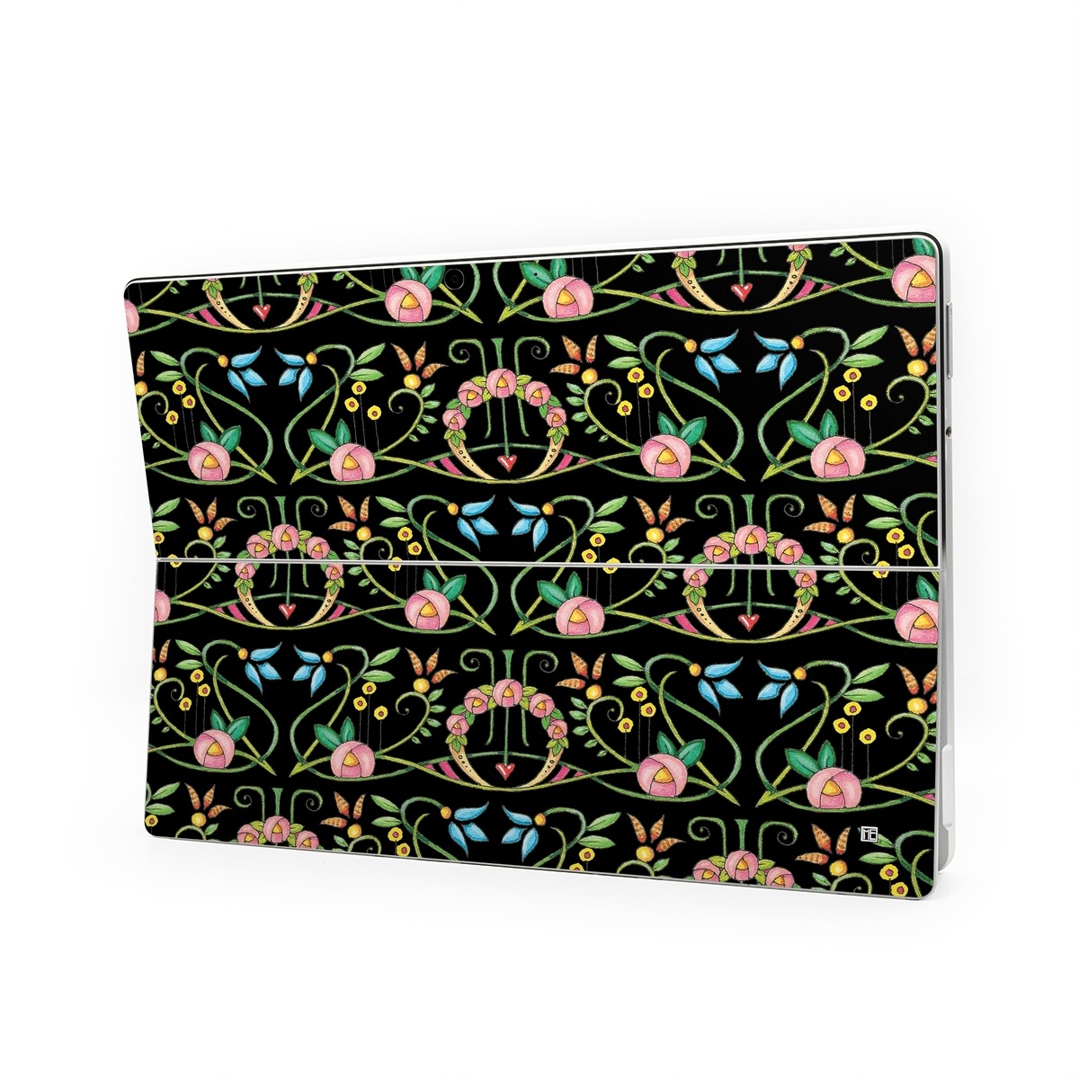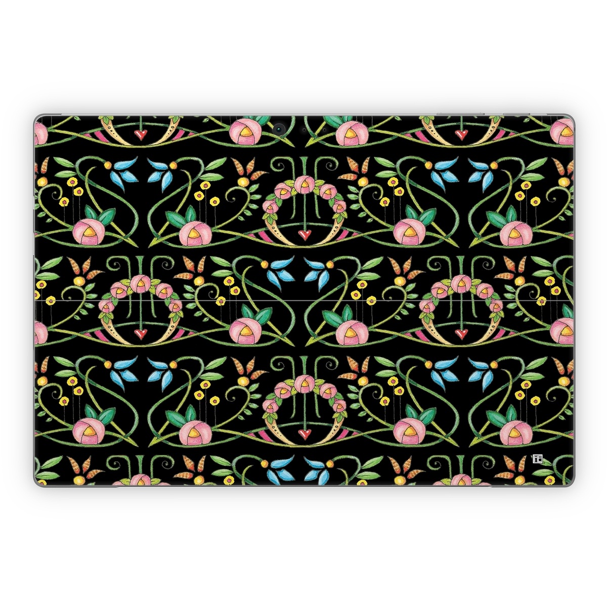 iStyles Microsoft Surface Pro Series Skin design of Flower, Rectangle, Textile, Ornament, Plant, Line, Motif, Creative arts, Art, Pattern, with black, pink, blue, green, yellow colors, and tagged with patterns, flowers, flower, arc, pattern.