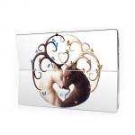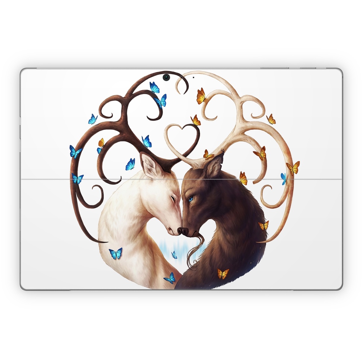 iStyles Microsoft Surface Pro Series Skin design of Gesture, Fawn, Serveware, Horn, Font, Art, Mythical creature, Dishware, Tail, Drinkware, with white, brown, blue, yellow, orange colors, and tagged with animals, signs, antlers, butterflies, deer, yinyang.