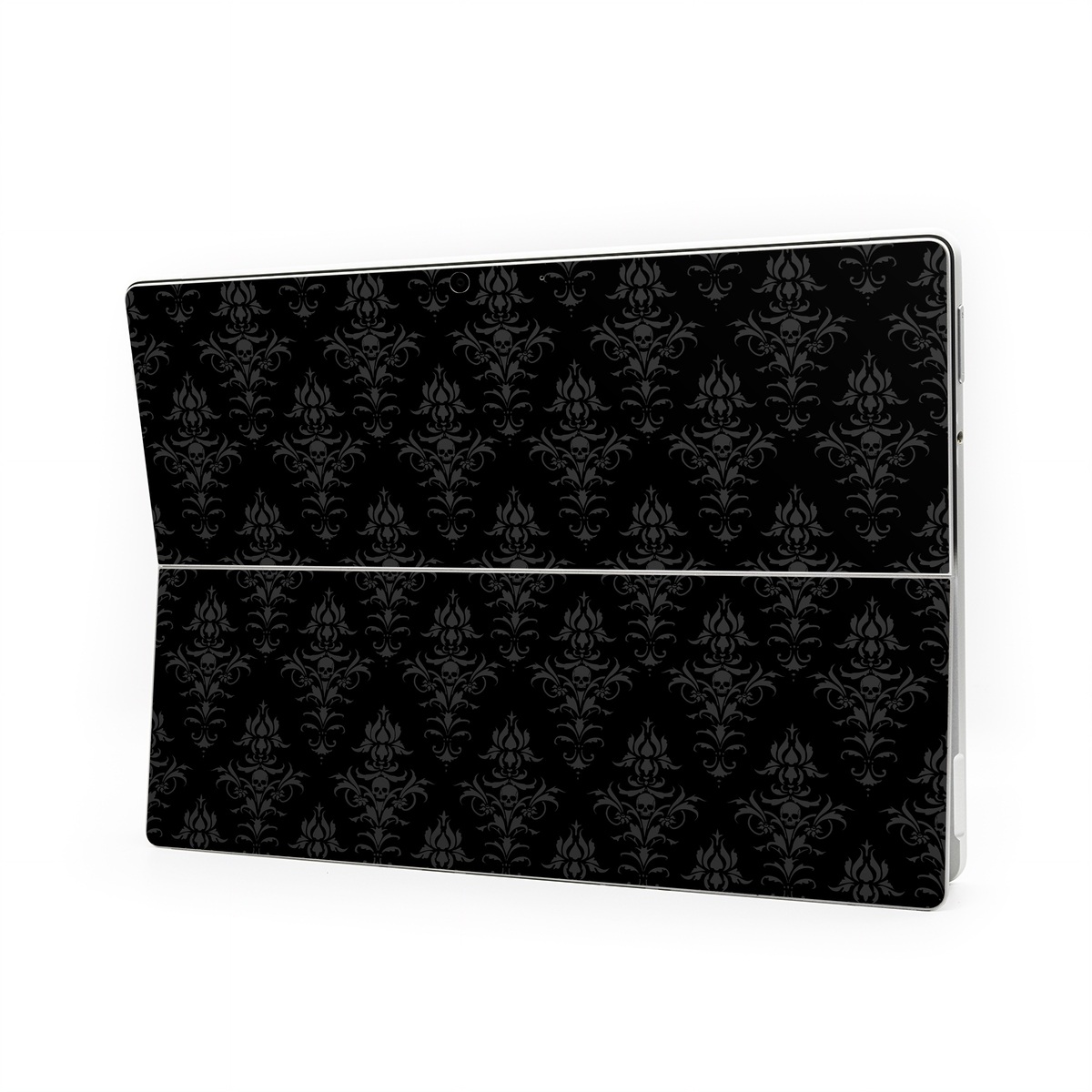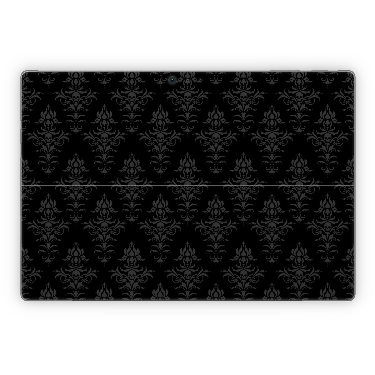 iStyles Microsoft Surface Pro Series Skin design of Black, Pattern, Design, Monochrome, Black-and-white, Darkness, Monochrome photography, Symmetry, with black, gray colors, and tagged with skulls, patterns.