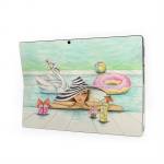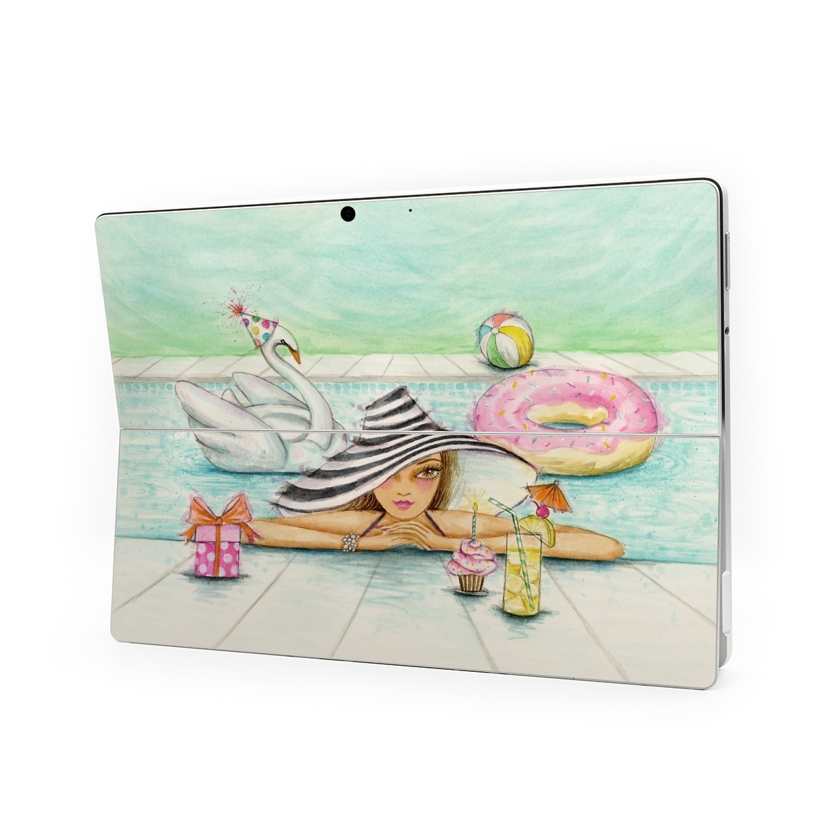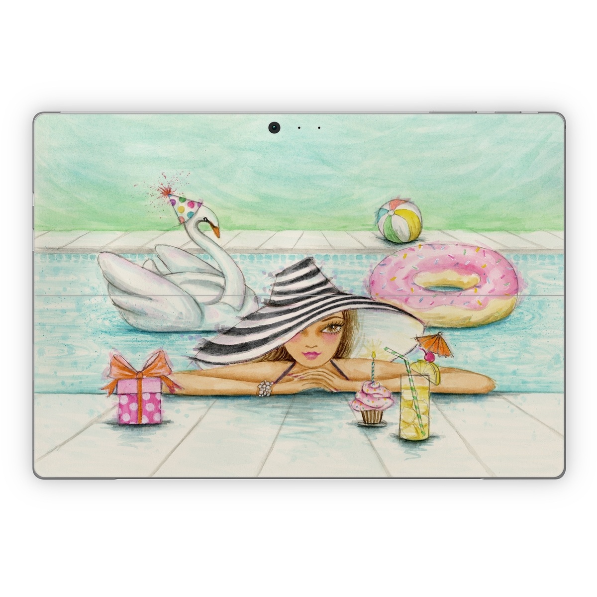 iStyles Microsoft Surface Pro Series Skin design of Watercolor paint, Illustration, Cartoon, Art, Painting, Drawing, Fictional character, with blue, pink, white, black, brown, red, green, yellow colors, and tagged with people, fineart, objects, animals, urban, drawn, face, faces, fashion, handdrawn, painting, portrait, woman, women, donut, present, cocktail, drink, swan, swimming, ball, cupcake.