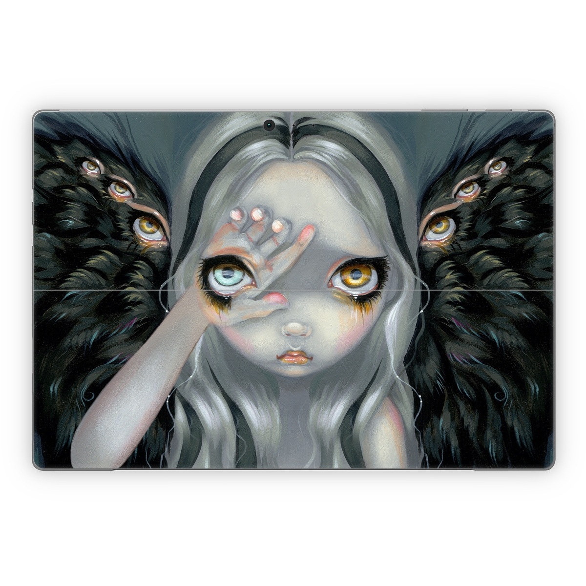 iStyles Microsoft Surface Pro Series Skin design of Face, Head, Cg artwork, Eye, Illustration, Organ, Fictional character, Art, Iris, Darkness, with black, gray, blue, green colors, and tagged with fantasy, people.