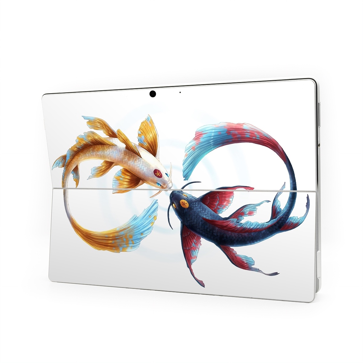 iStyles Microsoft Surface Pro Series Skin design of Marine invertebrates, Art, Wing, Feather, Tree, Beak, Electric blue, Fish, Natural material, Painting, with white, black, yellow, orange, red, blue colors, and tagged with animals, signs, blue, fish, koi, red, yellow.