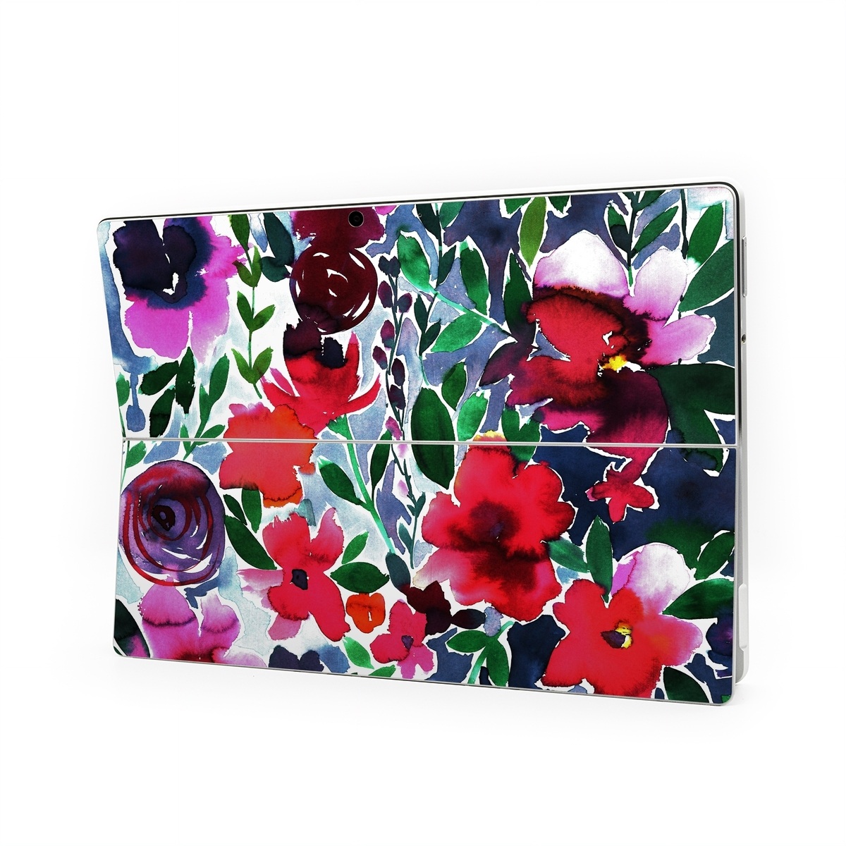 iStyles Microsoft Surface Pro Series Skin design of Flower, Petal, Red, Plant, Pattern, Pink, Purple, Flowering plant, Botany, Design, with red, green, pink, blue colors, and tagged with patterns, flowers, flowers, watercolor, watercolorflowers.