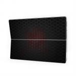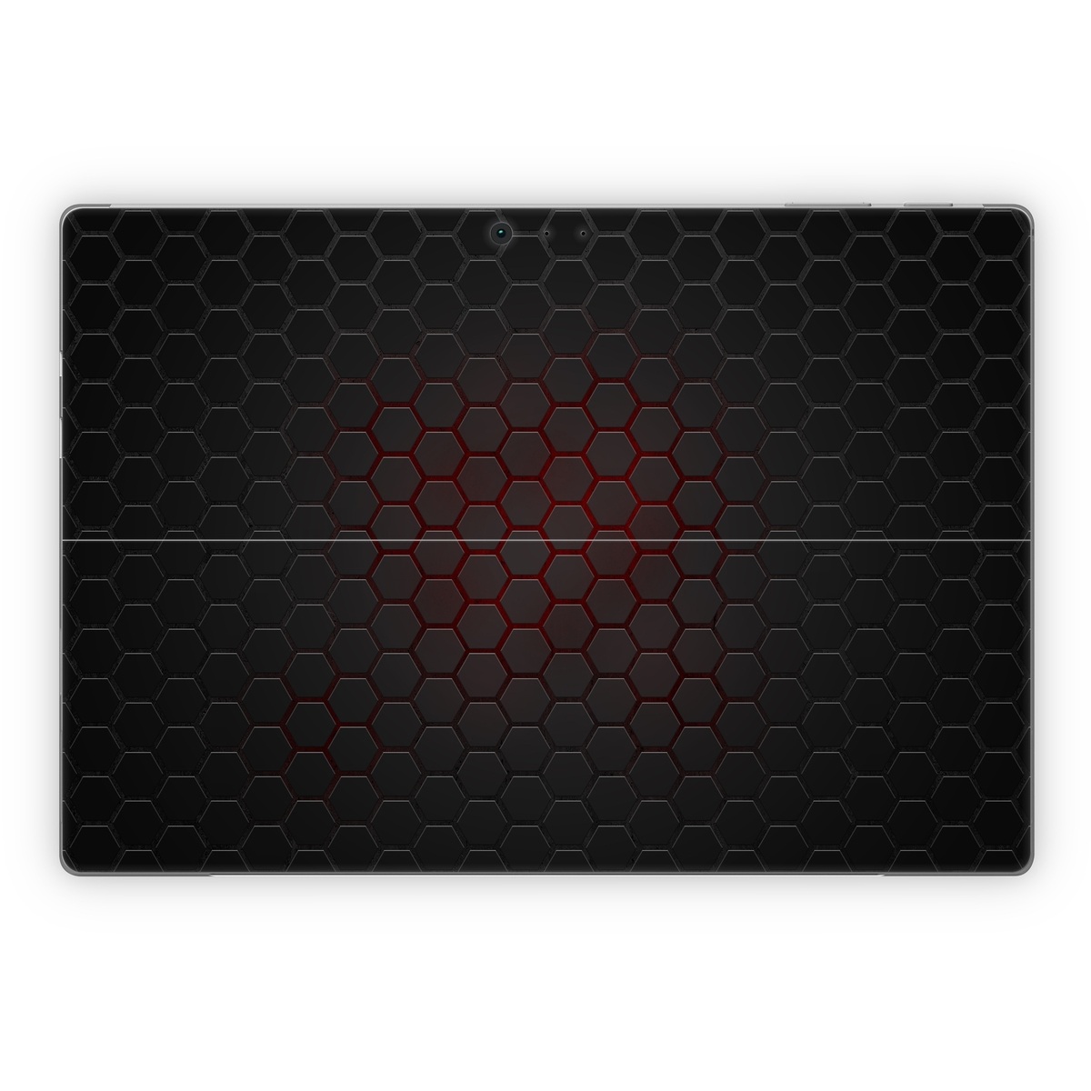 iStyles Microsoft Surface Pro Series Skin design of Black, Pattern, Metal, Design, Mesh, Carbon, Space, Wallpaper, with black, red colors, and tagged with lookslike, fantasy, space, drones, geometric, hexagon, tech.
