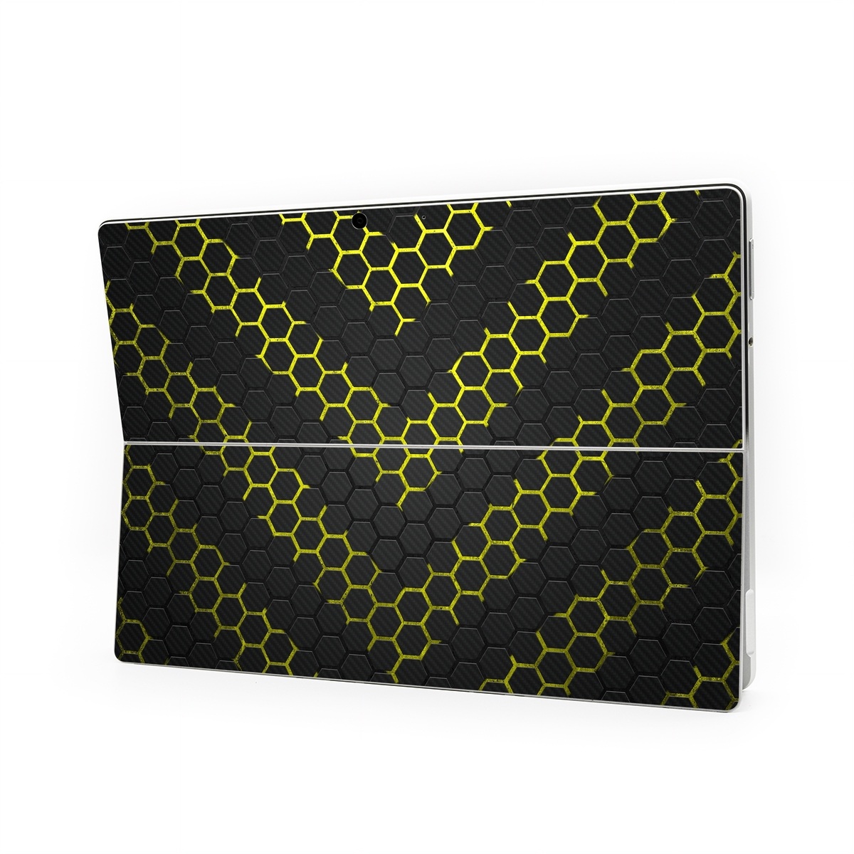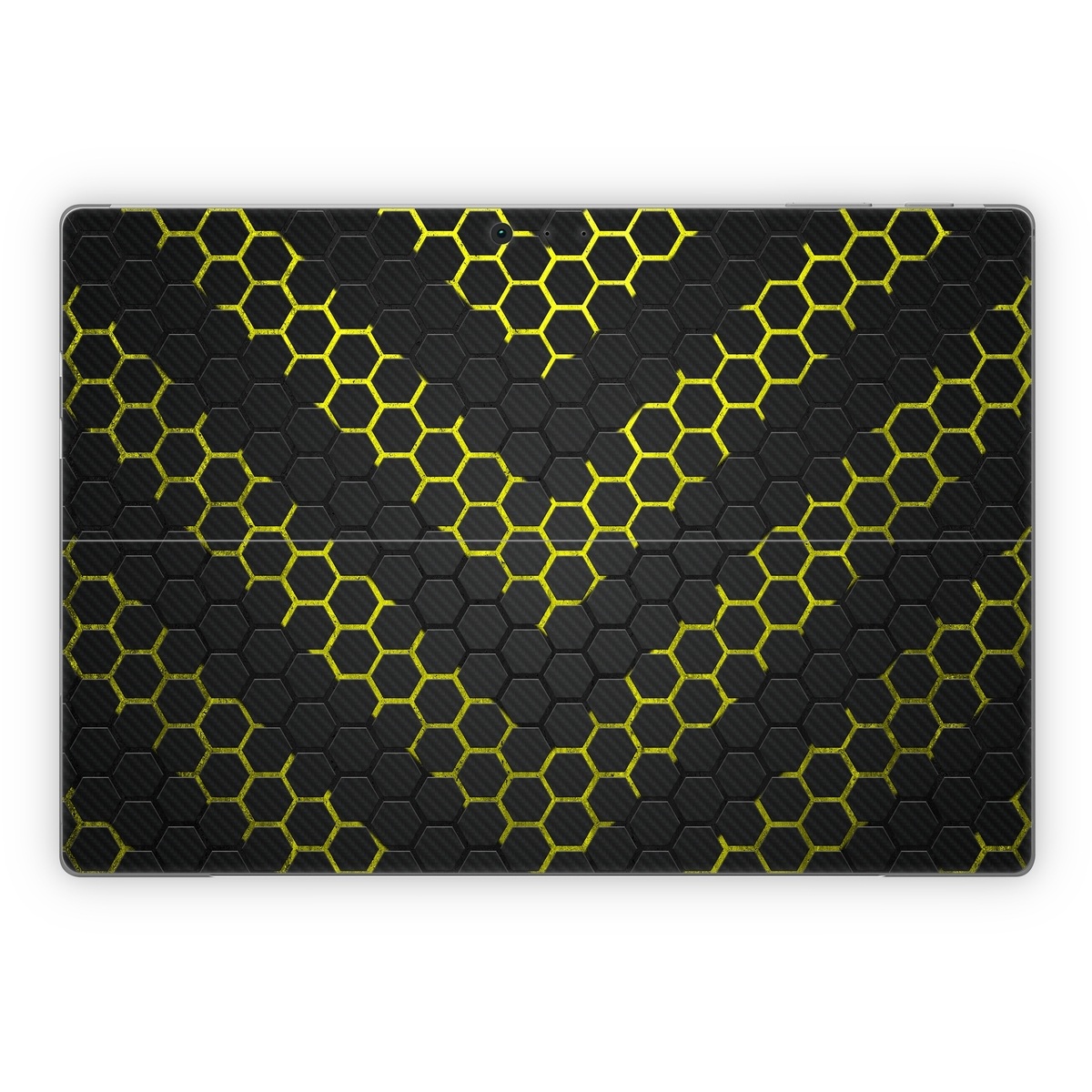 iStyles Microsoft Surface Pro Series Skin design of Black, Pattern, Yellow, Mesh, Net, Chain-link fencing, Design, Metal, with black, gray, yellow colors, and tagged with lookslike, space, fantasy, animals, drones, geometric, hexagon, tech.