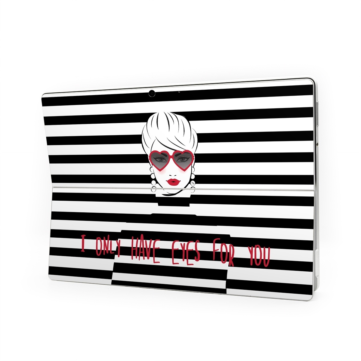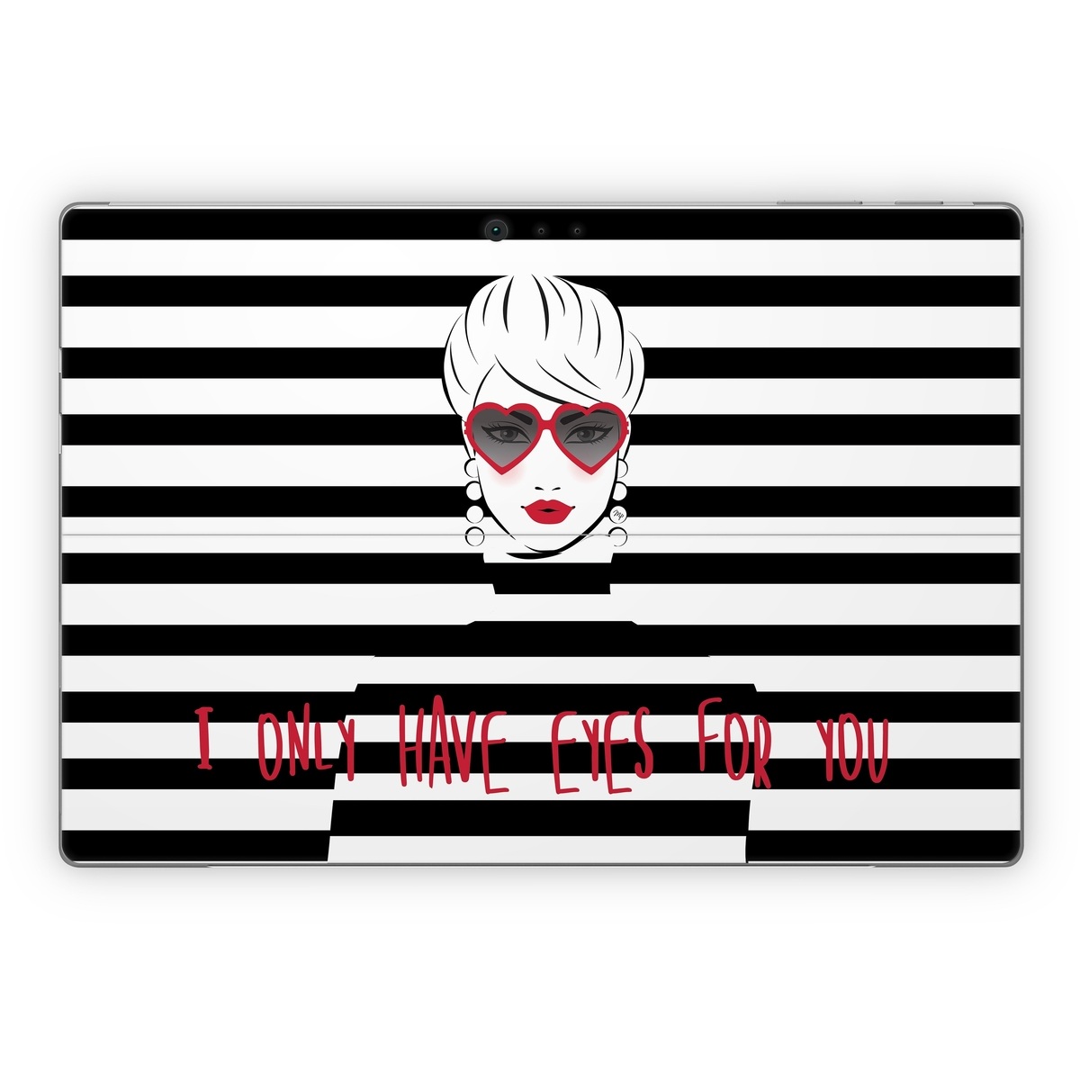 iStyles Microsoft Surface Pro Series Skin design of Rectangle, Font, Gesture, Eyewear, Art, Technology, Personal protective equipment, Goggles, Logo, Eyelash, with black, white, yellow, red colors, and tagged with signs, objects, people, patterns, blackandwhite, girl, glasses, red, stripes, only, have, eyes, for, you.