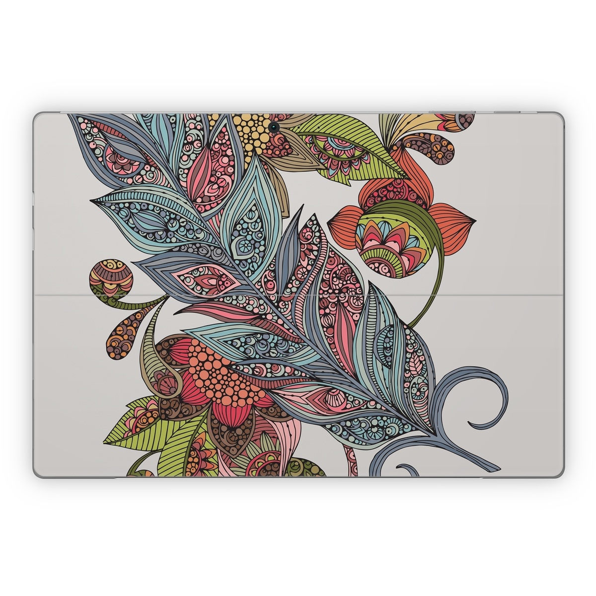 iStyles Microsoft Surface Pro Series Skin design of Botany, Plant, Leaf, Pattern, Flower, Illustration, Design, Motif, Protea family, Flowering plant, with green, blue, pink, red, yellow, orange, gray, brown colors, and tagged with flowers, patterns, feather, flower.