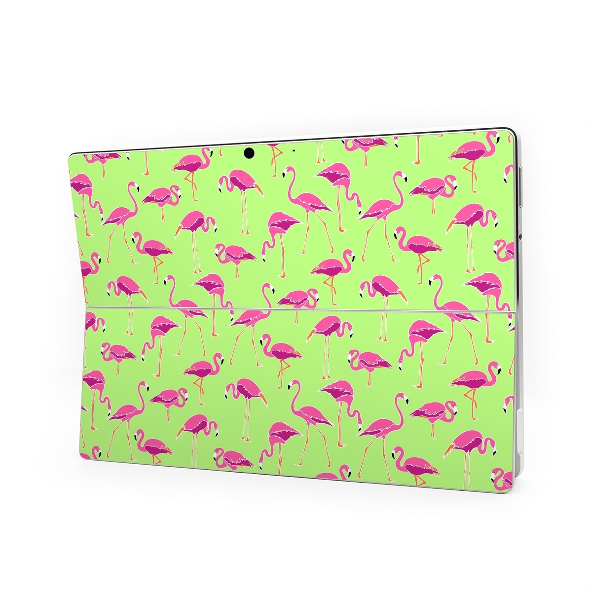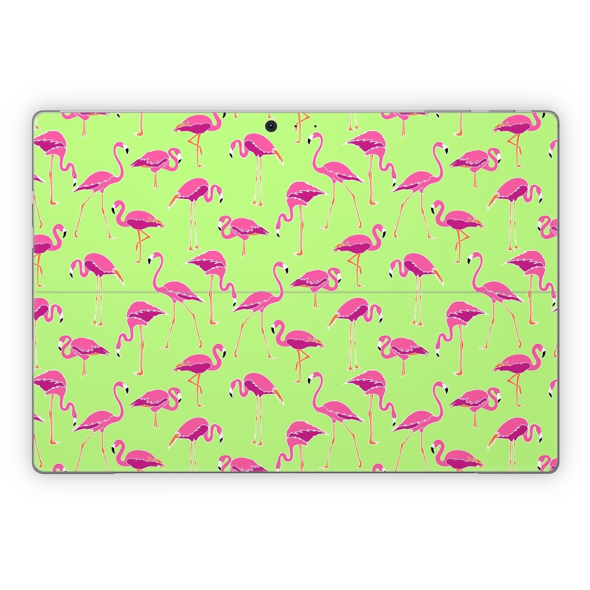iStyles Microsoft Surface Pro Series Skin design of Pink, Green, Red, Pattern, Wrapping paper, Textile, Design, Flamingo, Line, with pink, green colors, and tagged with patterns, animals, animals, birds, flamingo, nature.