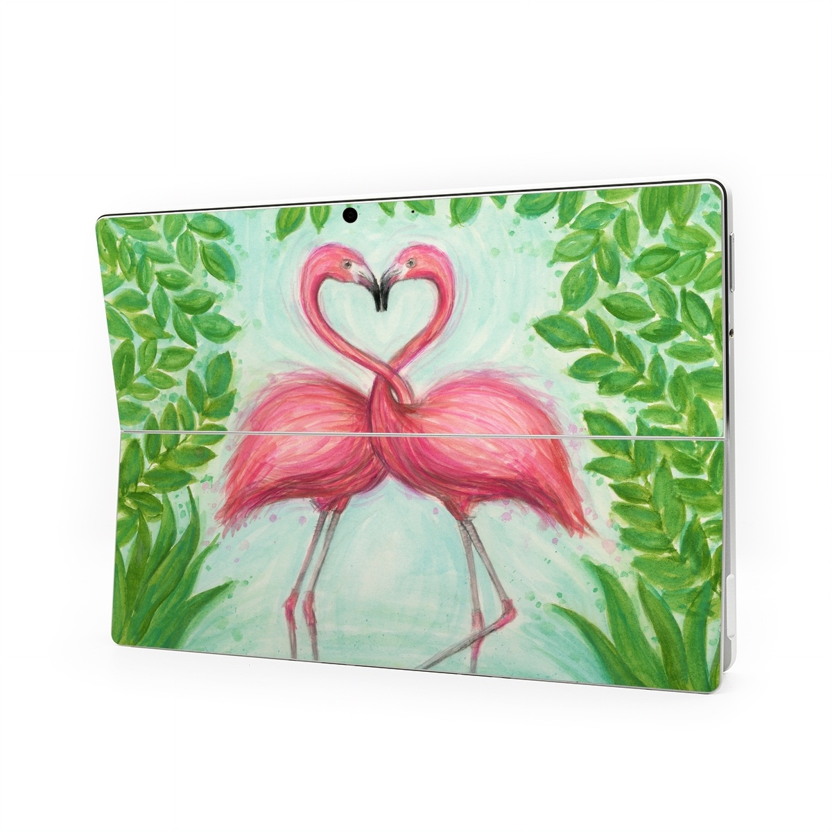 iStyles Microsoft Surface Pro Series Skin design of Flamingo, Greater flamingo, Bird, Water bird, Pink, Illustration, Watercolor paint, Organism, Drawing, Stork, with pink, blue, green colors, and tagged with fineart, animals, hearts, nature, animals, birds, flamingo, tropical, tropics.